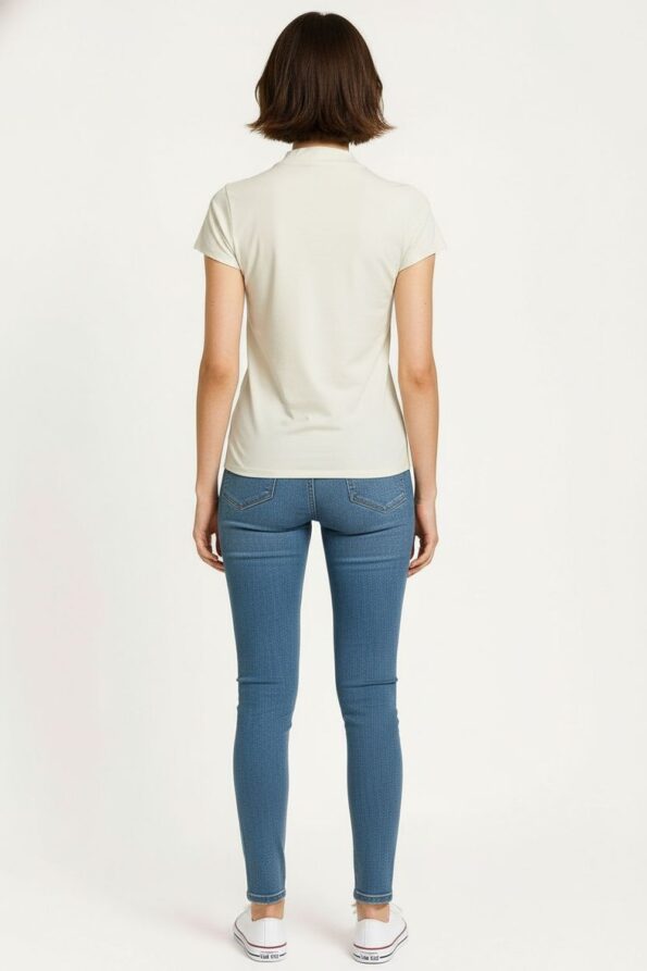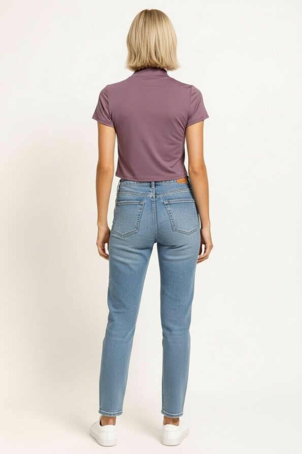 Playera de cuerpo corto confeccionada en tejido elástico con textura acanalada que brinda comodidad y estilo, cuello alto que estiliza el cuello y añade un toque sofisticado, mangas cortas con acabado ajustado que realzan la figura, estructura ligera que se adapta al cuerpo, terminaciones limpias que aseguran un acabado moderno y versátil