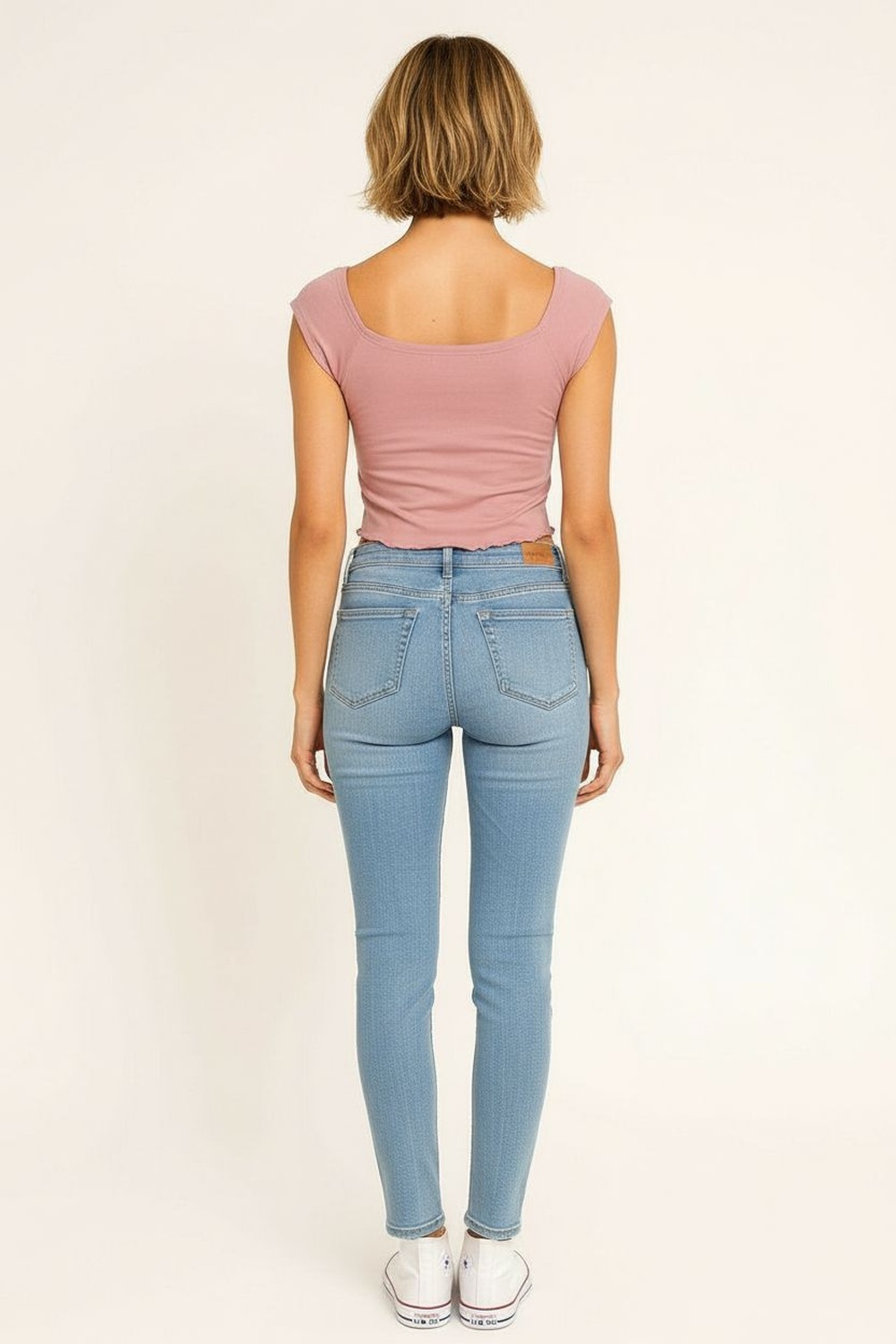 Playera crop de escote amplio que deja los hombros al descubierto, manga corta integrada, aplicación frontal decorativa que aporta detalle sutil, largo a la cintura que equilibra proporciones, confección en tejido suave con elasticidad