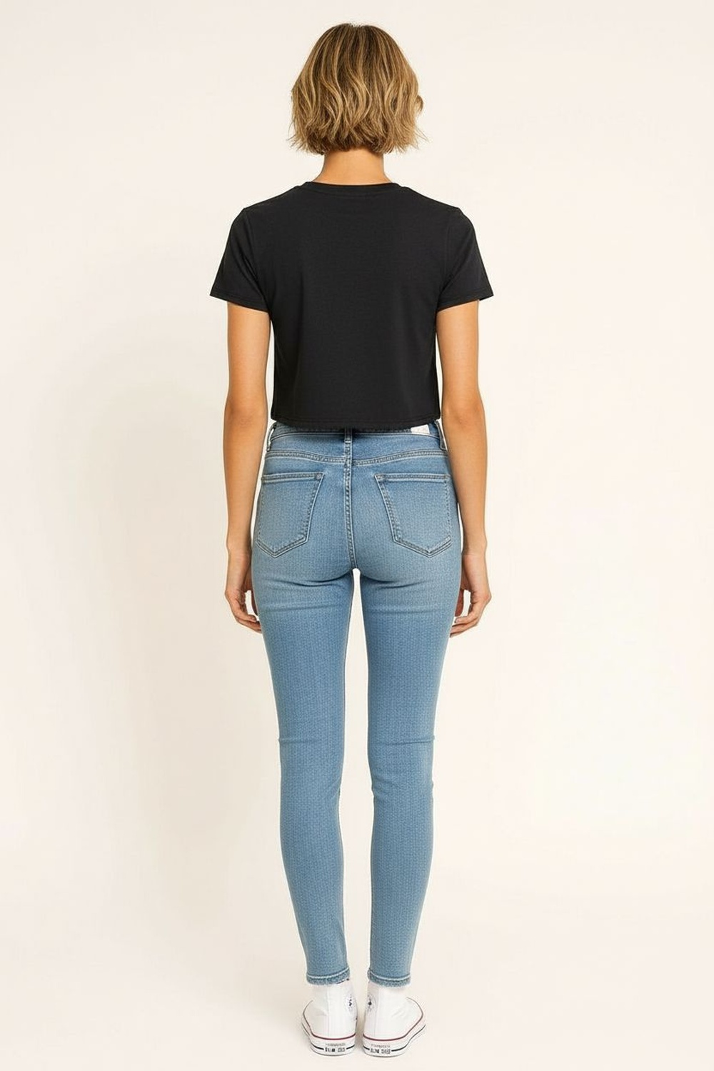 Playera de corte corto con silueta ajustada que define el contorno superior, cuello redondo con acabado limpio que brinda estructura al escote, manga corta integrada al cuerpo que aporta comodidad y ajuste uniforme, confección en tejido suave al tacto con gráfico frontal aplicado que añade carácter visual a la prenda, largo por arriba de la cintura que resalta la proporción del diseño