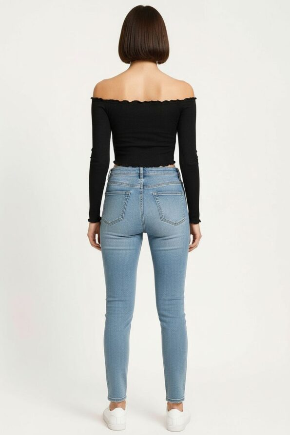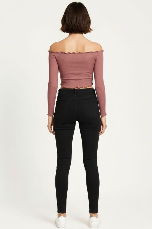 Playera crop de manga larga confeccionada en tejido rib hacchi de textura suave que aporta comodidad, diseño con escote recto elástico que permite un ajuste seguro, terminado festoneado en cuello, puños y dobladillo que añade un toque femenino, estructura ajustada que realza la figura y costuras finas que mantienen un acabado pulido