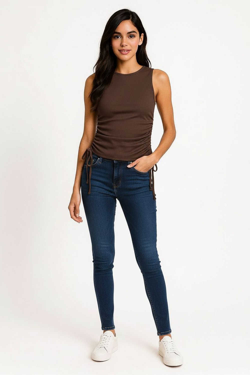 Playera crop sin mangas confeccionada en tejido acanalado que aporta elasticidad y comodidad, cuello redondo clásico que realza la parte superior, jaretas ajustables en costados que permiten regular el largo y darle un toque moderno, silueta entallada que resalta la figura, ideal para combinar con pantalones de tiro alto o faldas de temporada en looks juveniles y frescos