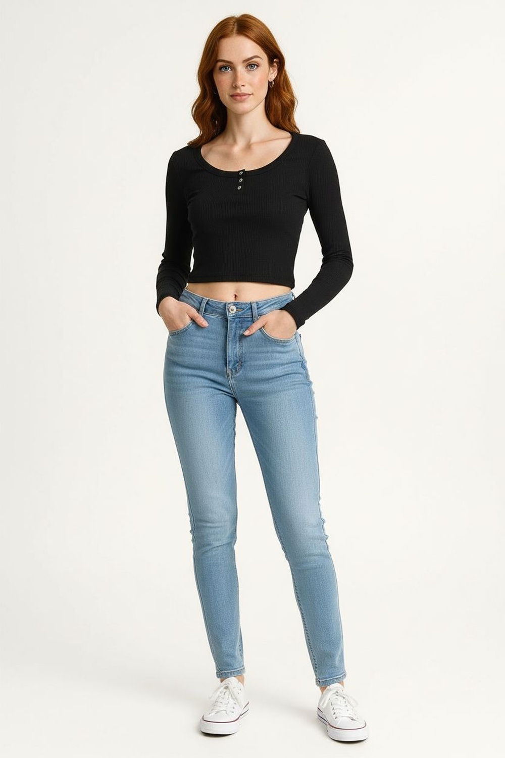 Playera crop de manga larga con escote redondo que aporta un estilo juvenil, media aletilla con botones frontales que brindan un detalle moderno, tejido rib elástico que se ajusta a la silueta y realza la figura, pretina ancha que define la cintura, ideal para outfits casuales o combinaciones con prendas de tiro alto