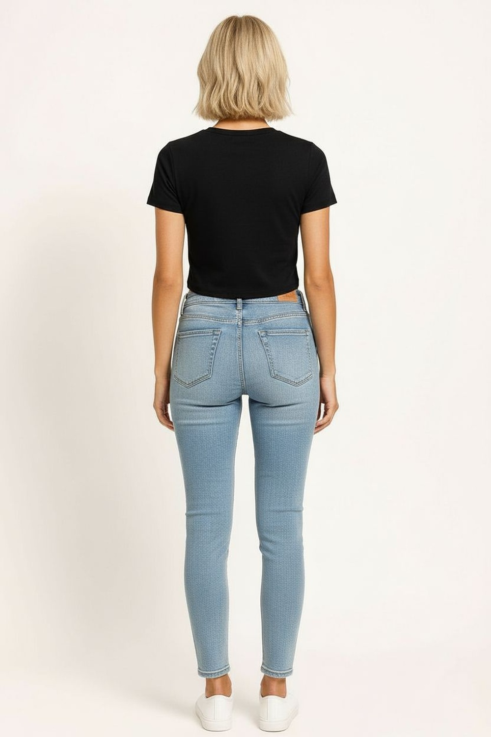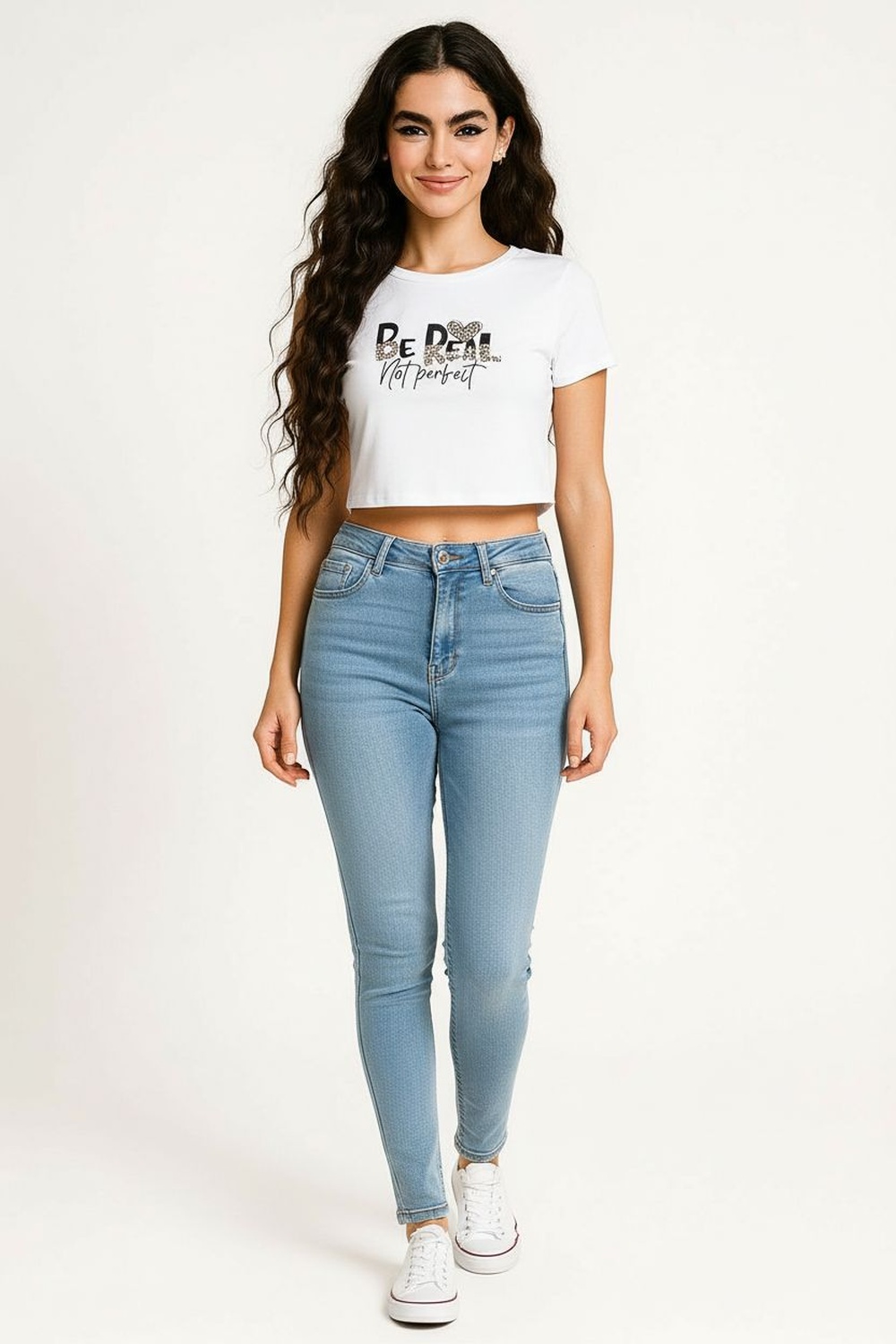 Playera tipo crop elaborada en tejido de algodón suave al tacto, manga corta con terminación limpia, cuello redondo que brinda ajuste clásico, diseño frontal con aplicación integrada, largo a la cintura que equilibra la silueta