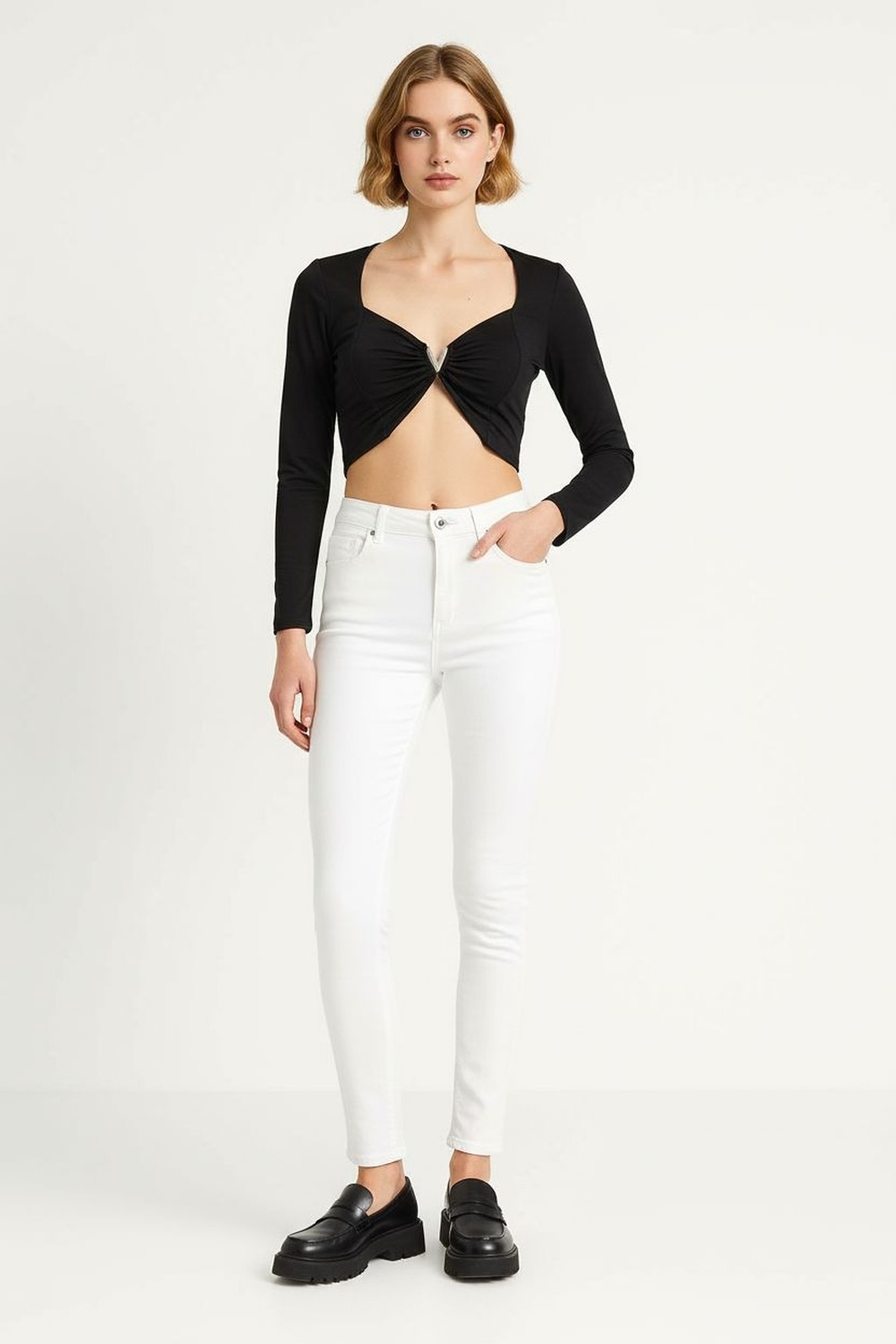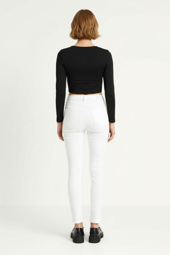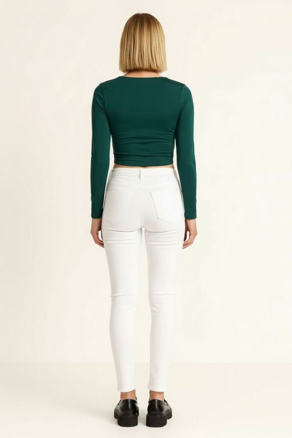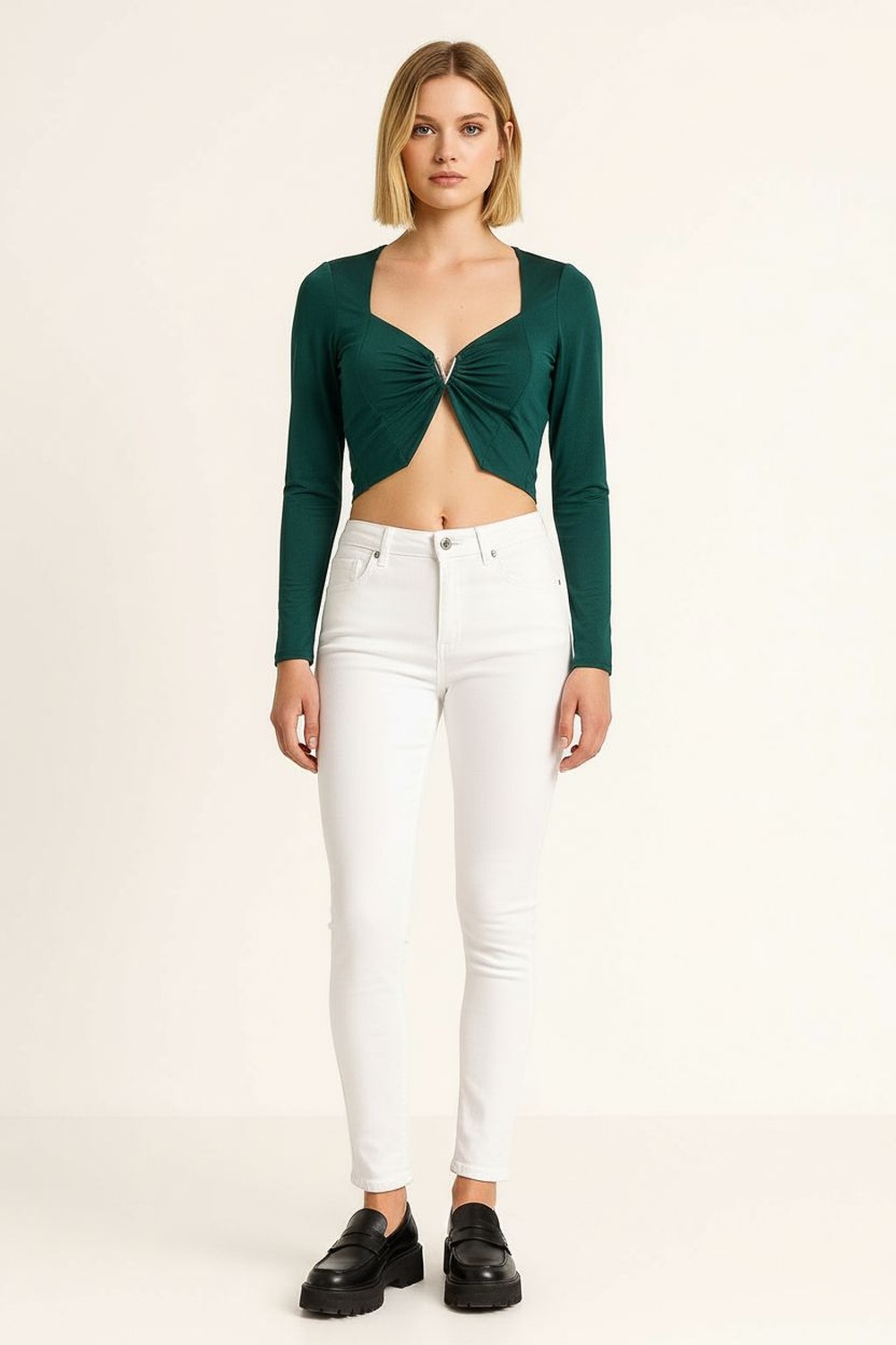 Playera de manga larga con diseño cruzado en el escote que realza el busto y aporta un toque sensual, detalle central fruncido que acentúa la silueta, corte corto por encima de la cintura que estiliza y brinda un look juvenil, confección en tela elástica que se ajusta cómodamente al cuerpo ofreciendo suavidad y libertad de movimiento, acabados reforzados que garantizan durabilidad