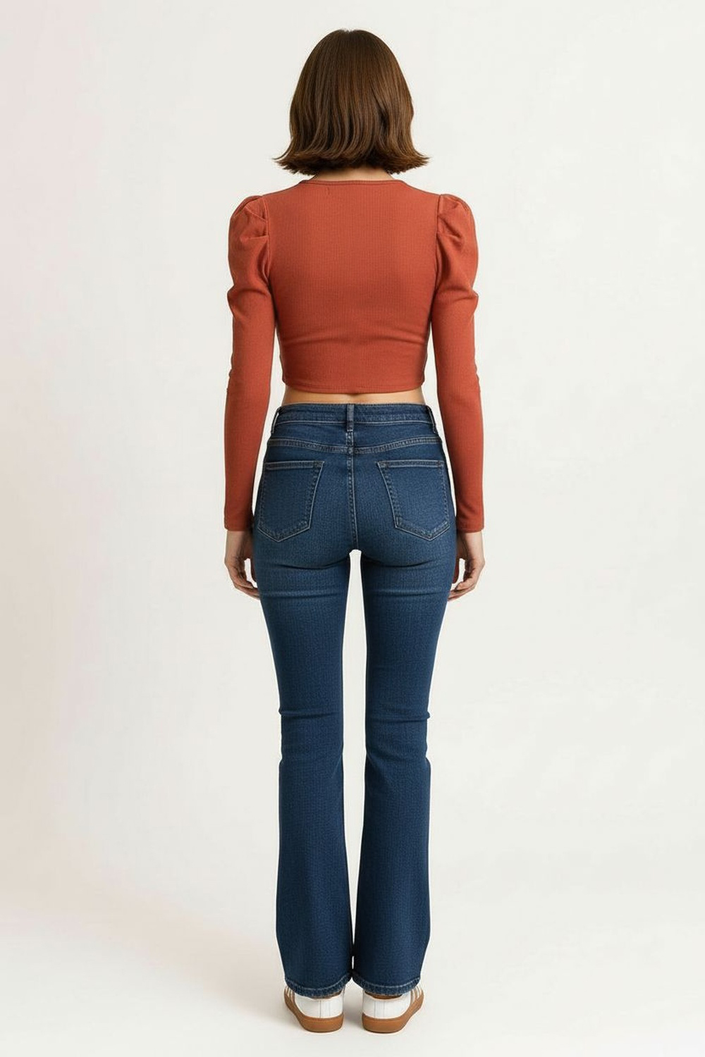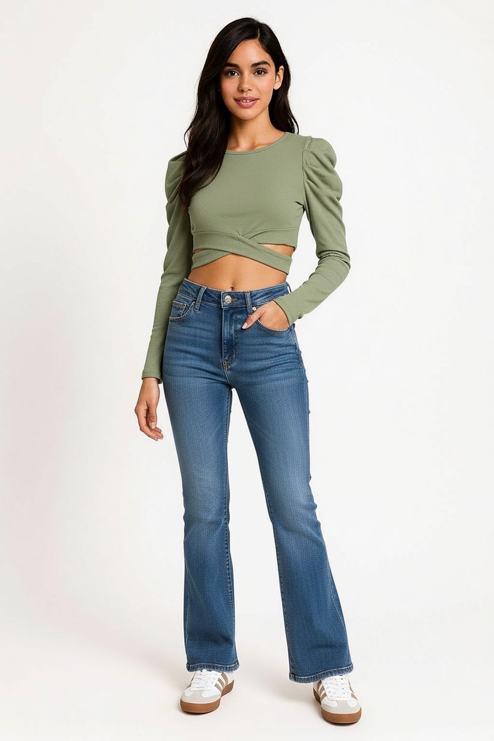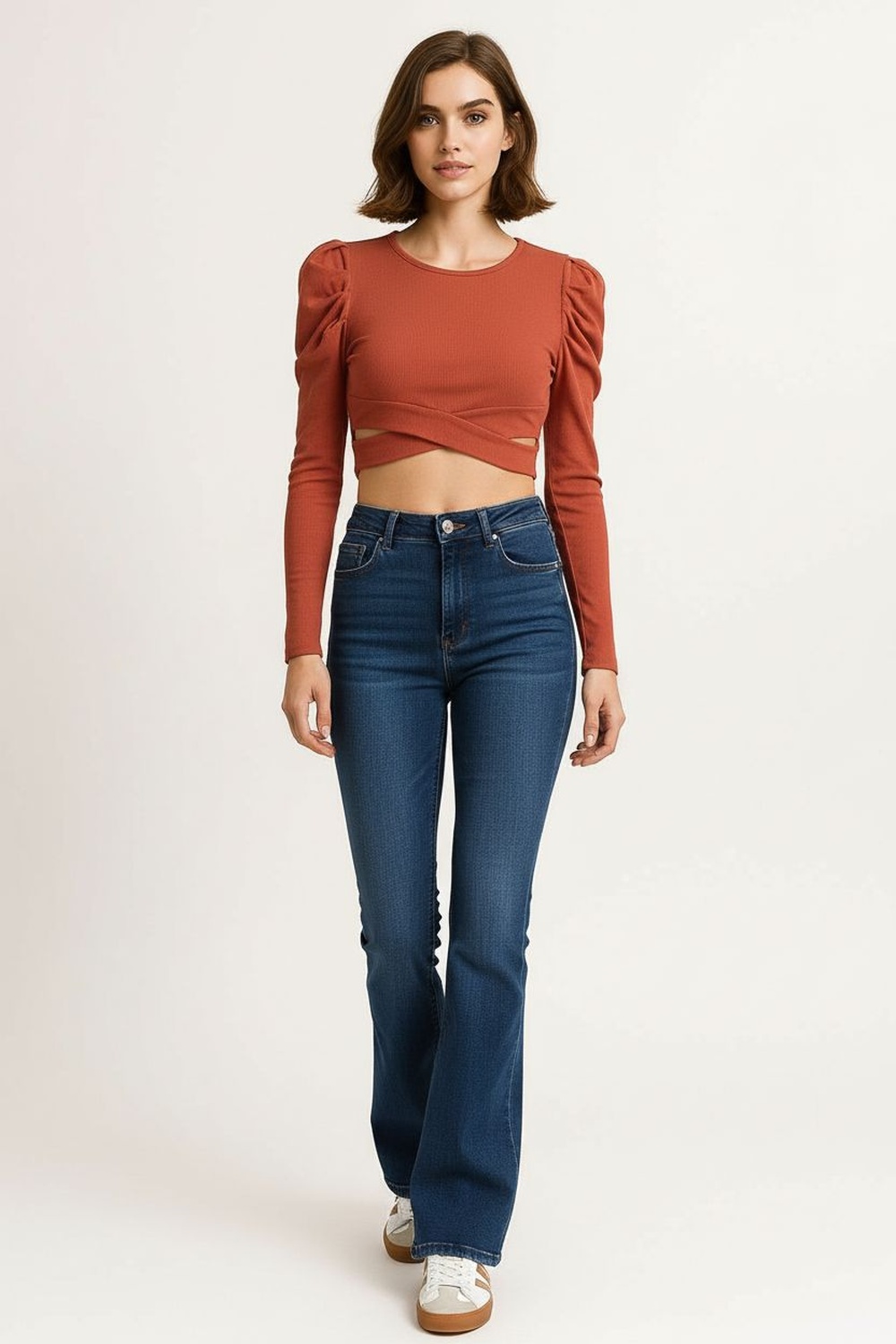 Playera de punto acanalado con pretina cruzada al frente que realza la cintura, manga larga con frunce en hombros que agrega volumen y diseño estilizado, escote redondo con terminación limpia y confección elástica que brinda comodidad