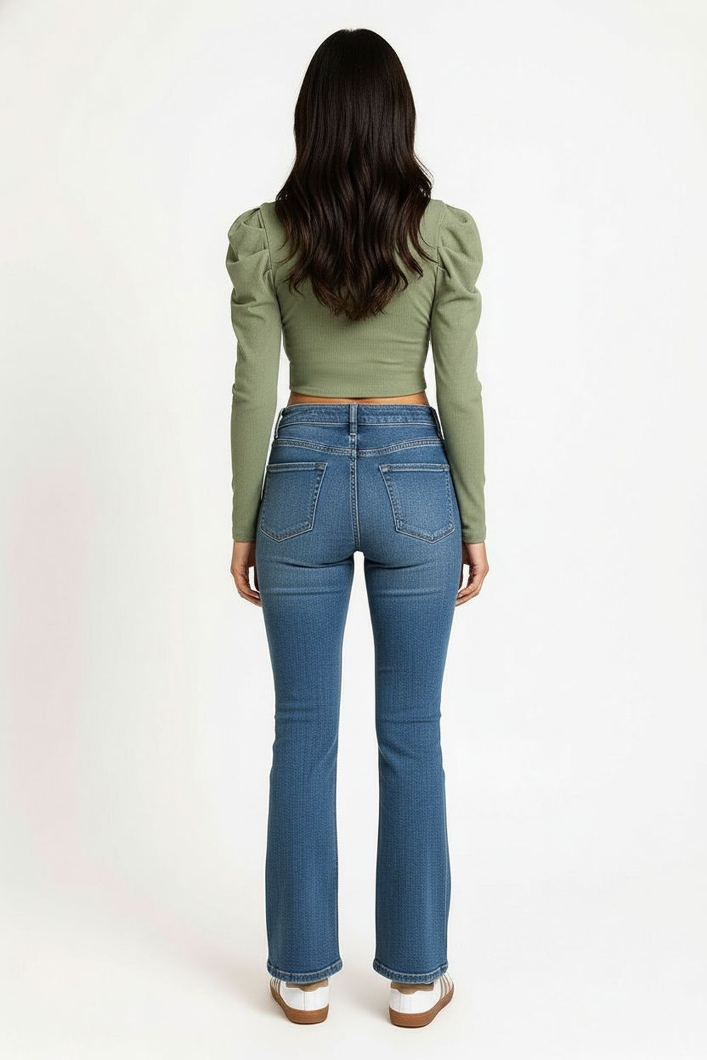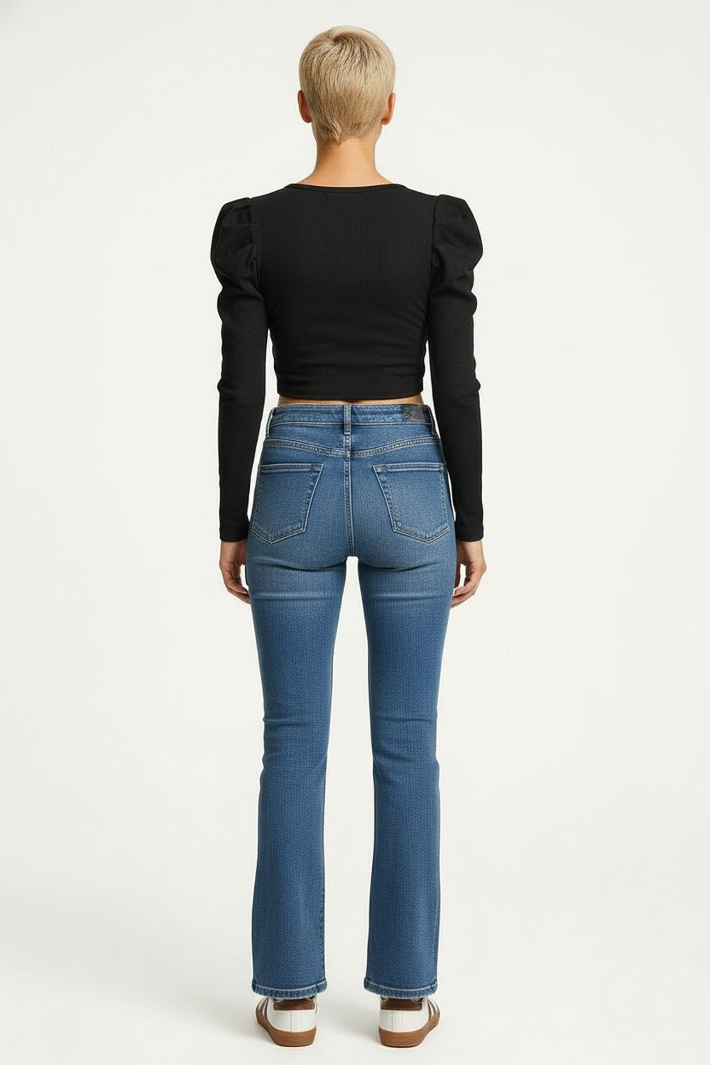 Blusa de escote cuadrado con volantes amplios en hombros que aportan volumen, espalda abierta con cinta para amarre ajustable que realza la figura, corte corto con confección en tejido suave de textura ligera, estructura firme que mantiene la forma y costuras limpias para un acabado moderno y juvenil