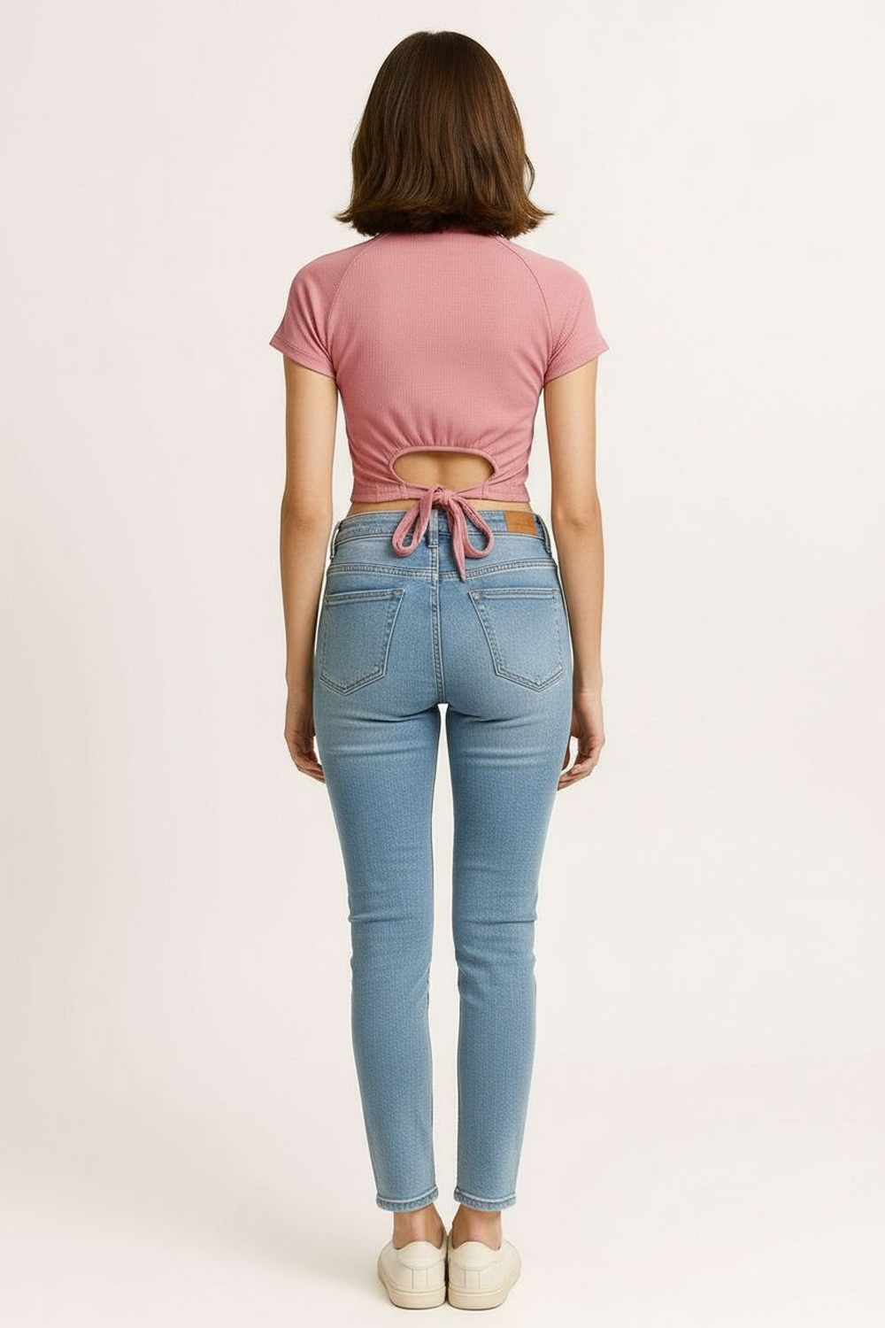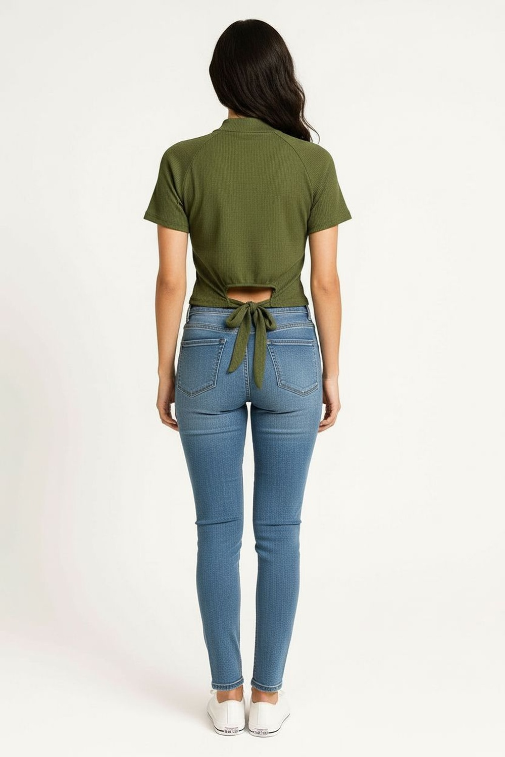 Playera de cuello alto con cierre frontal funcional que permite ajuste personalizado, manga corta integrada al cuerpo, espalda abierta con amarre que brinda sujeción y detalle distintivo, confección en tejido elástico de textura uniforme