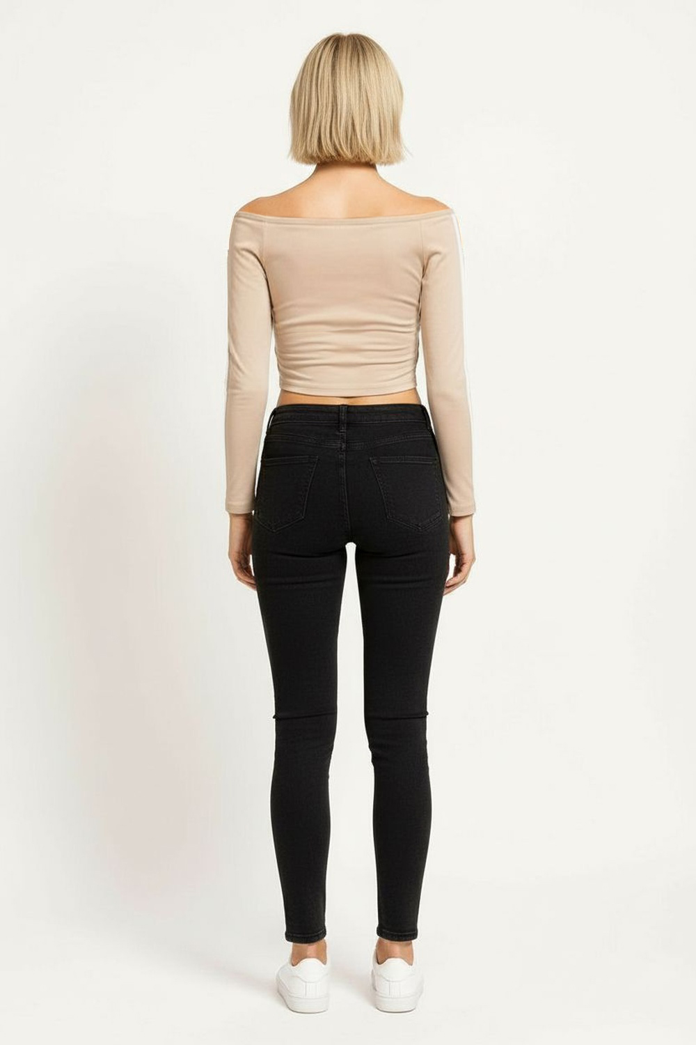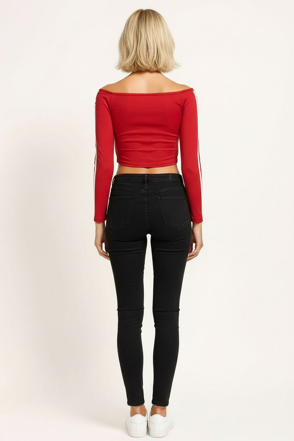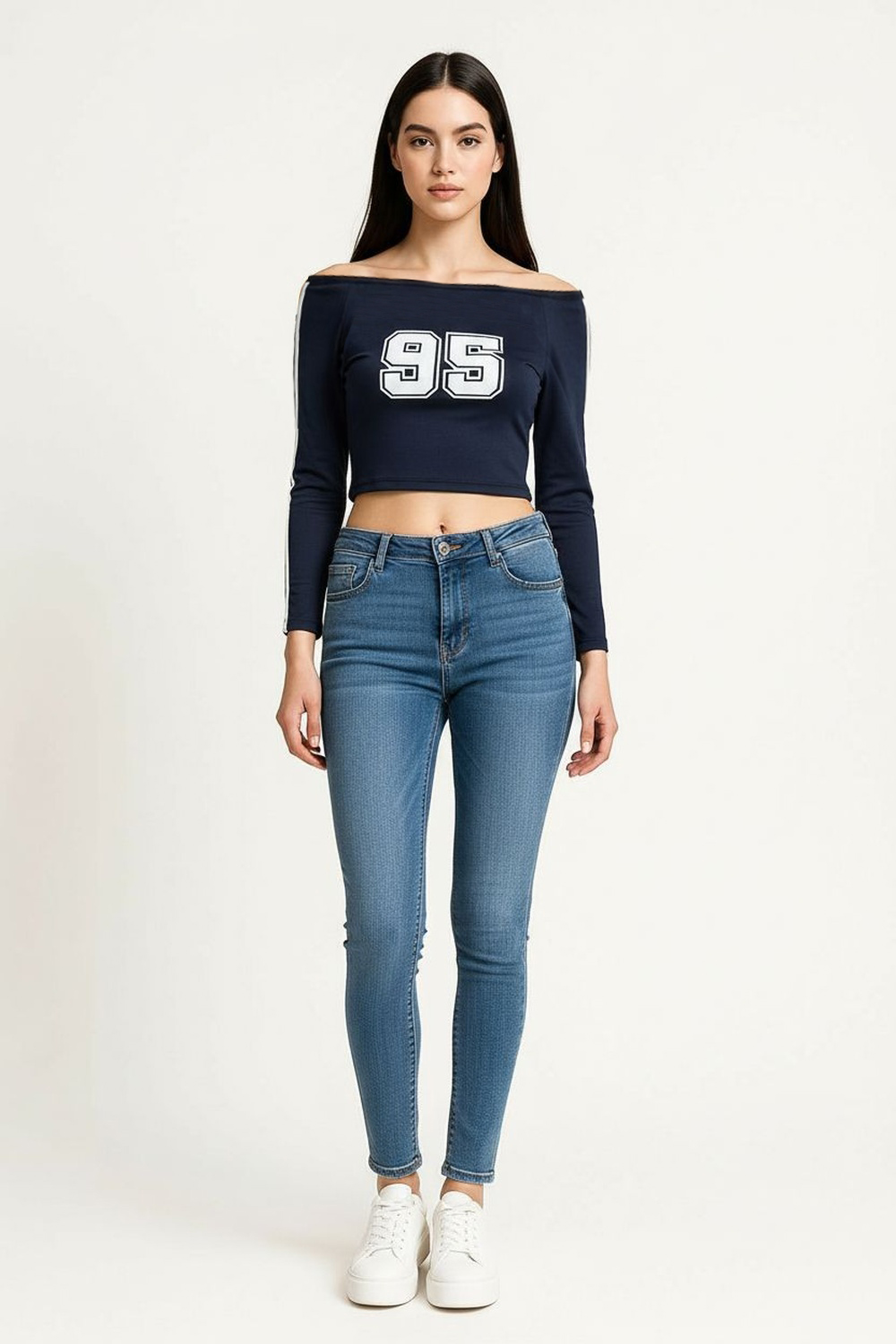Playera de manga larga con cuello amplio que aporta comodidad en el contorno superior, diseño corto que realza la estructura del torso, aplicación frontal con detalle numérico en relieve que genera atractivo visual, mangas con líneas laterales que añaden contraste y estructura, confección en tejido suave con elasticidad que facilita el movimiento y mantiene ajuste definido