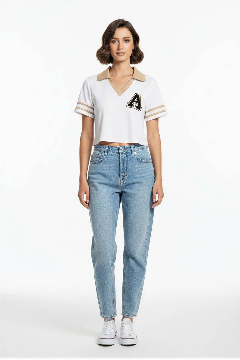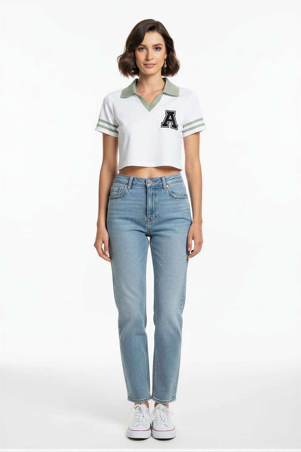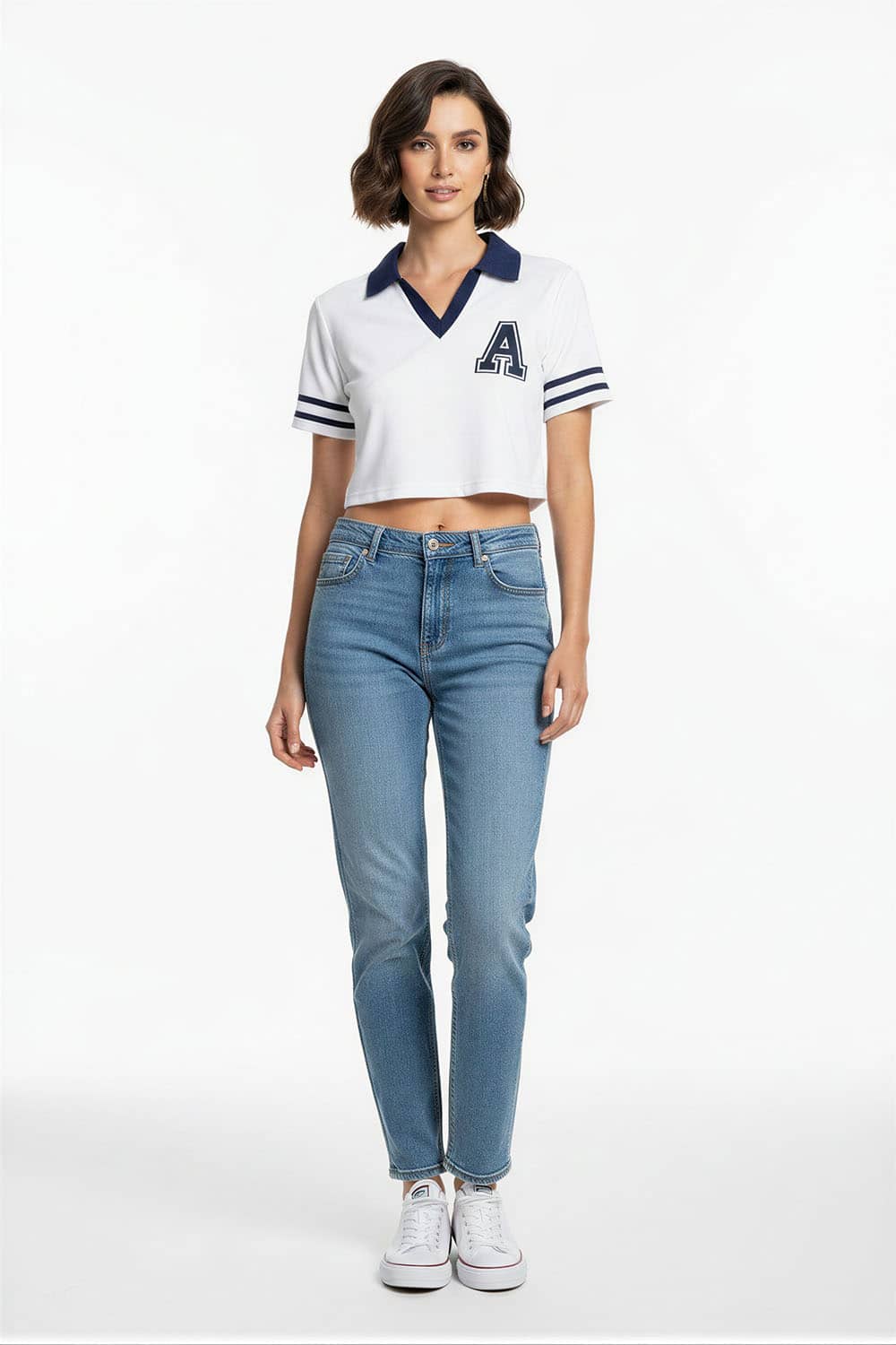 Playera tipo polo de corte corto con ajuste al cuerpo, cuello camisero con acabado en contraste que aporta estructura, manga corta con terminación ajustada que brinda comodidad, confección en tejido suave con ligera elasticidad que favorece el movimiento, detalle aplicado al frente que agrega un toque distintivo en la prenda