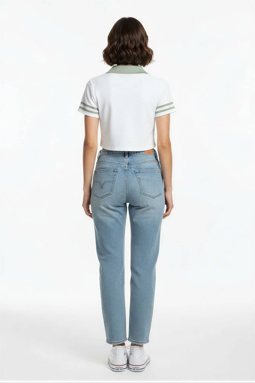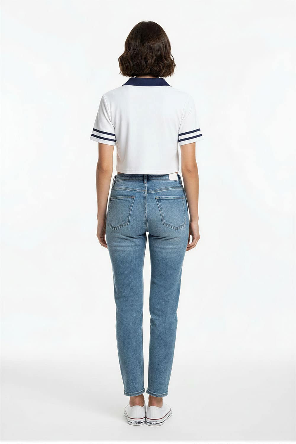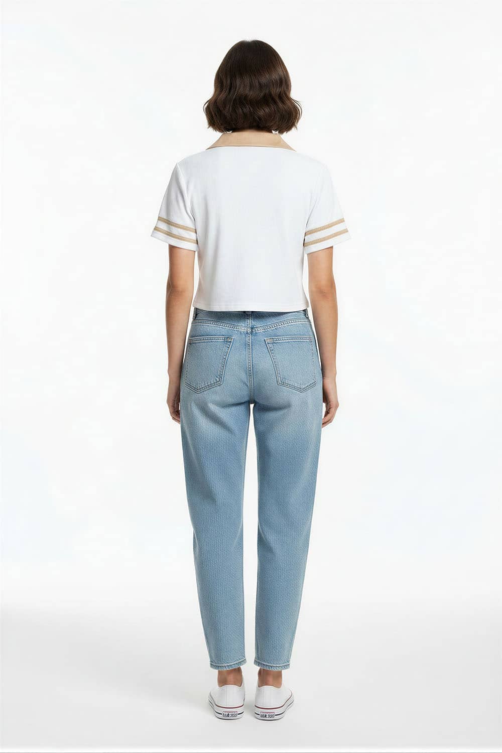 Playera tipo polo de corte corto con ajuste al cuerpo, cuello camisero con acabado en contraste que aporta estructura, manga corta con terminación ajustada que brinda comodidad, confección en tejido suave con ligera elasticidad que favorece el movimiento, detalle aplicado al frente que agrega un toque distintivo en la prenda