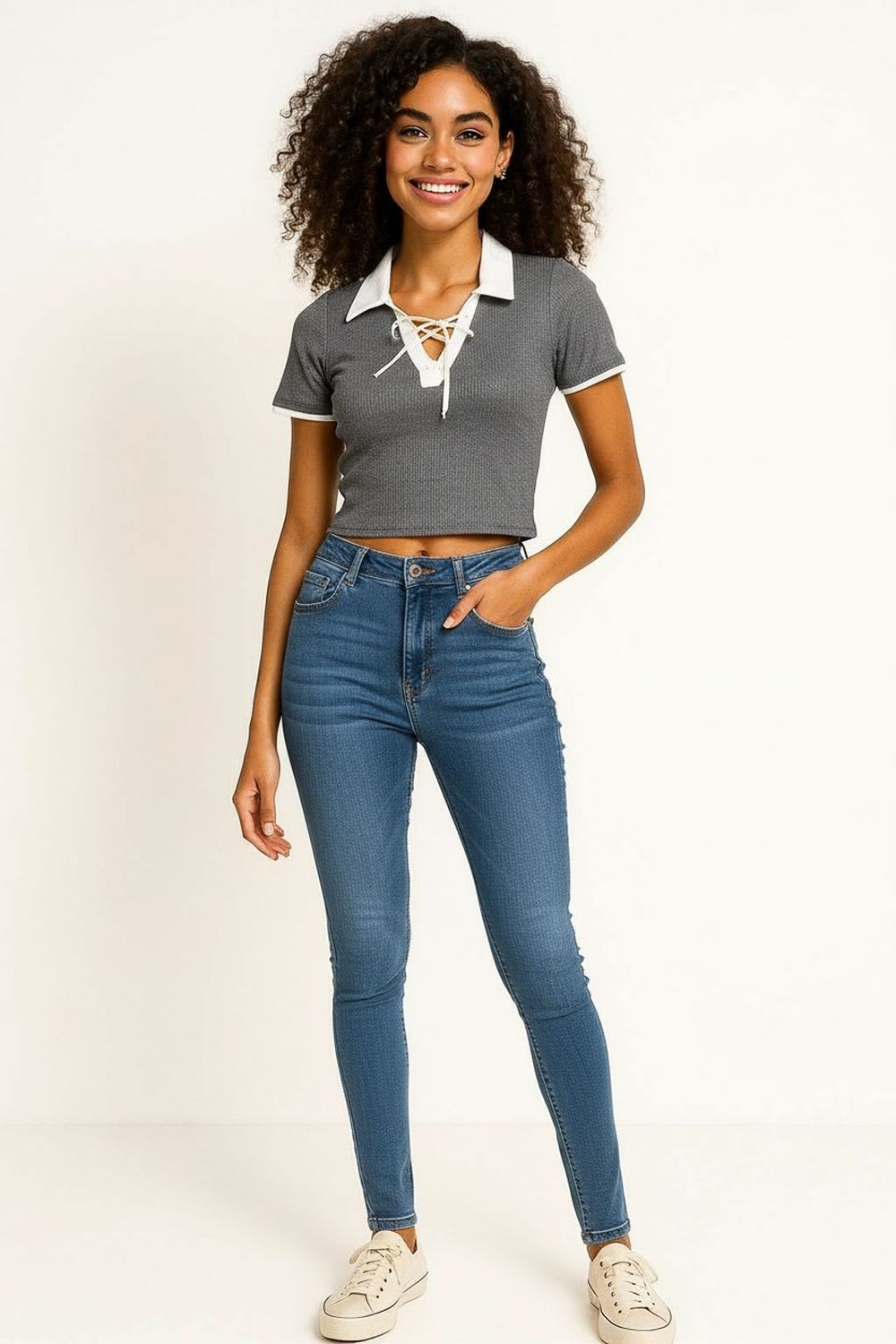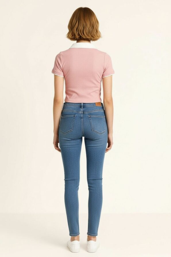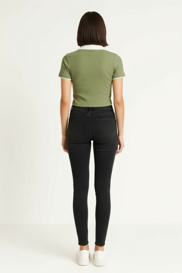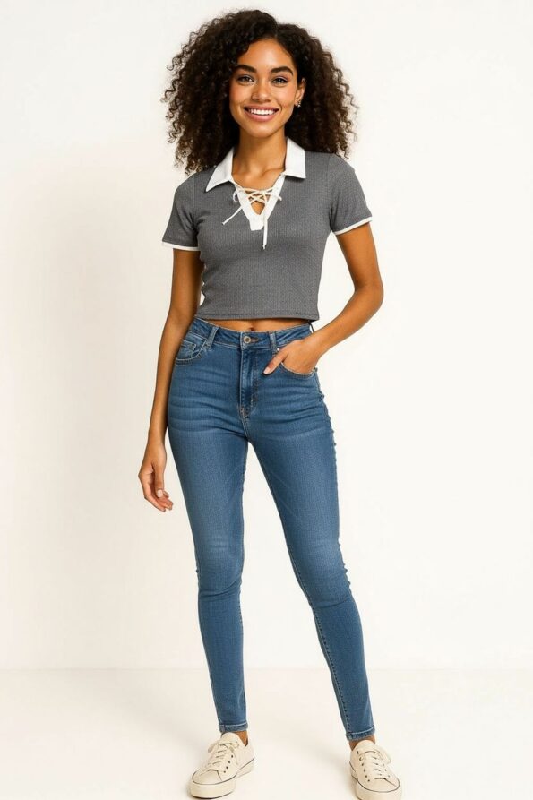 Playera de manga corta confeccionada en tejido rib que se ajusta cómodamente al cuerpo, cuello camisero en contraste que aporta un aire moderno y distintivo, escote con jareta entrecruzada que añade un detalle atractivo y femenino, diseño crop que estiliza la figura y realza la cintura, acabado elástico que ofrece libertad de movimiento y comodidad en todo momento