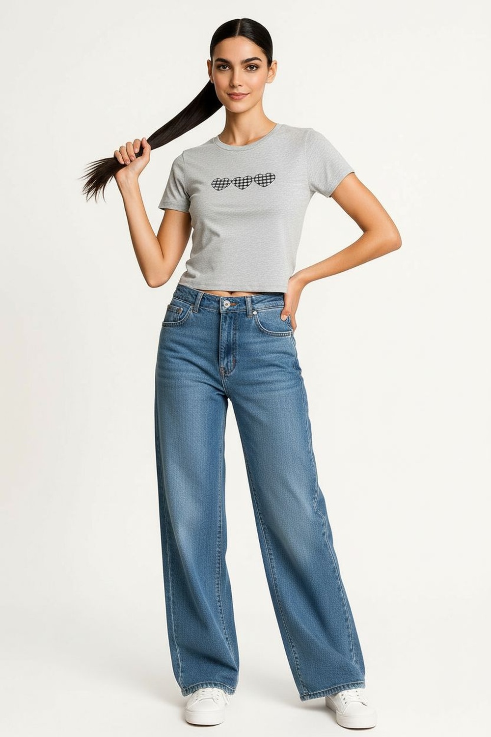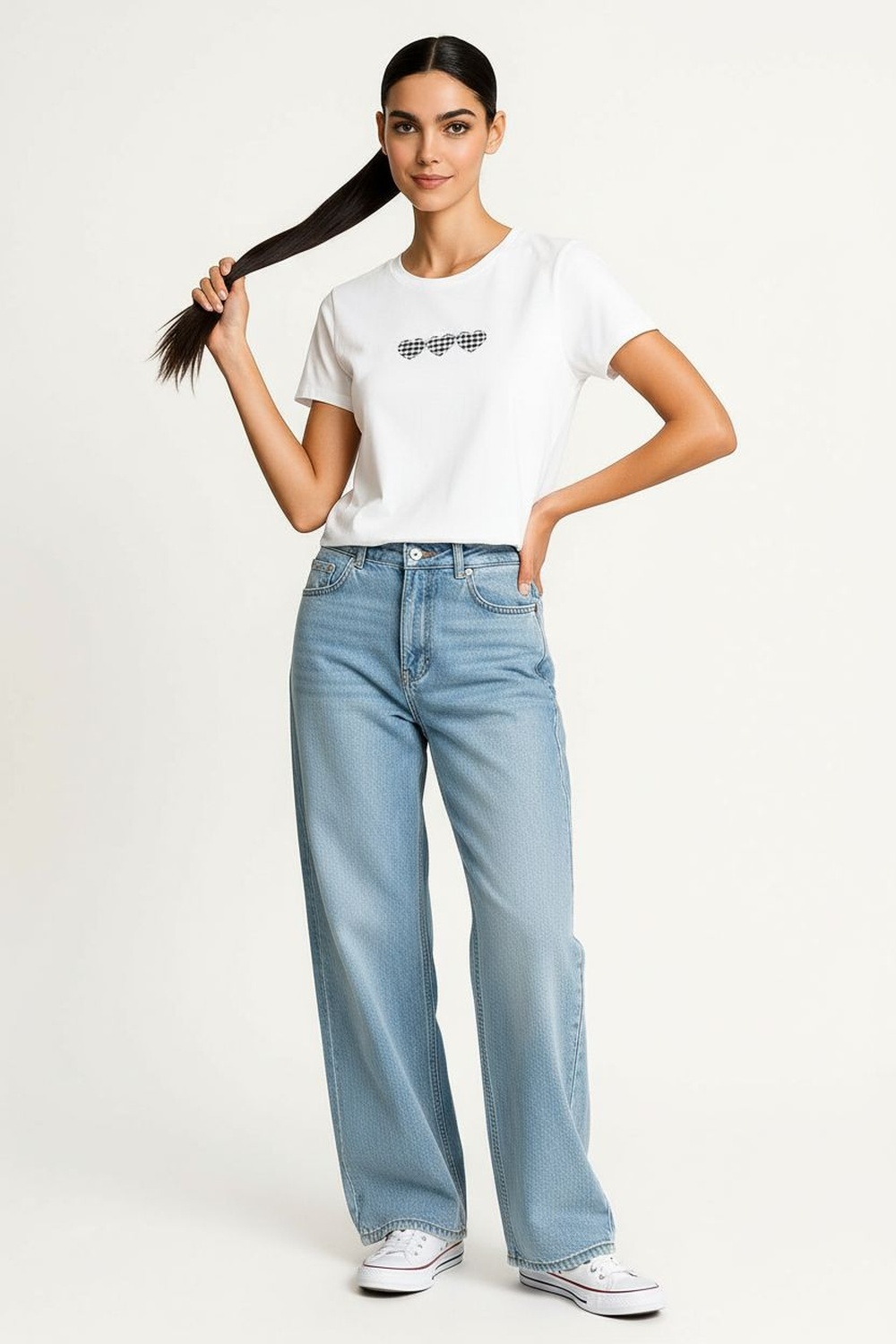 Playera de manga corta con cuello redondo y aplicación decorativa al frente, estructura recta y ajuste cómodo al cuerpo