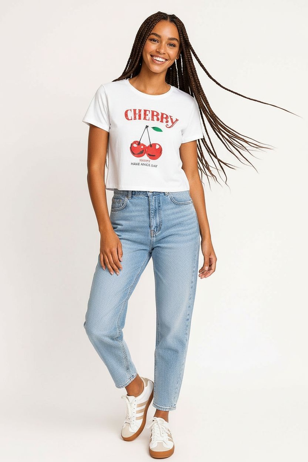 Playera de manga corta con cuello redondo y corte corto, confección en algodón de tacto suave que brinda comodidad, diseño gráfico frontal con tipografía decorativa y figuras centrales bien definidas, largo a la cintura que aporta frescura, acabados limpios en cuello y mangas