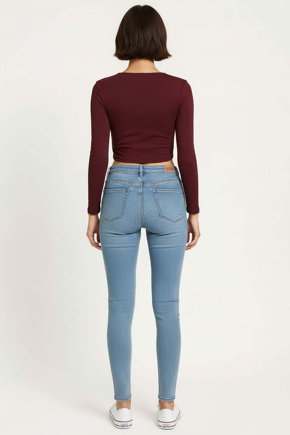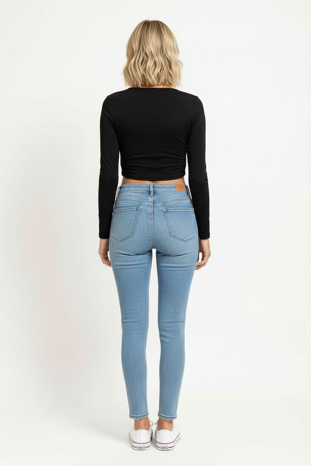Jeans de tiro alto con corte campana que alarga visualmente la figura, cinco bolsillos funcionales y cierre metálico frontal, pretina firme con botón al tono, mezclilla stretch que ofrece comodidad y estructura durante todo el día