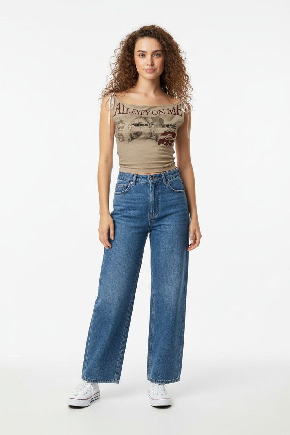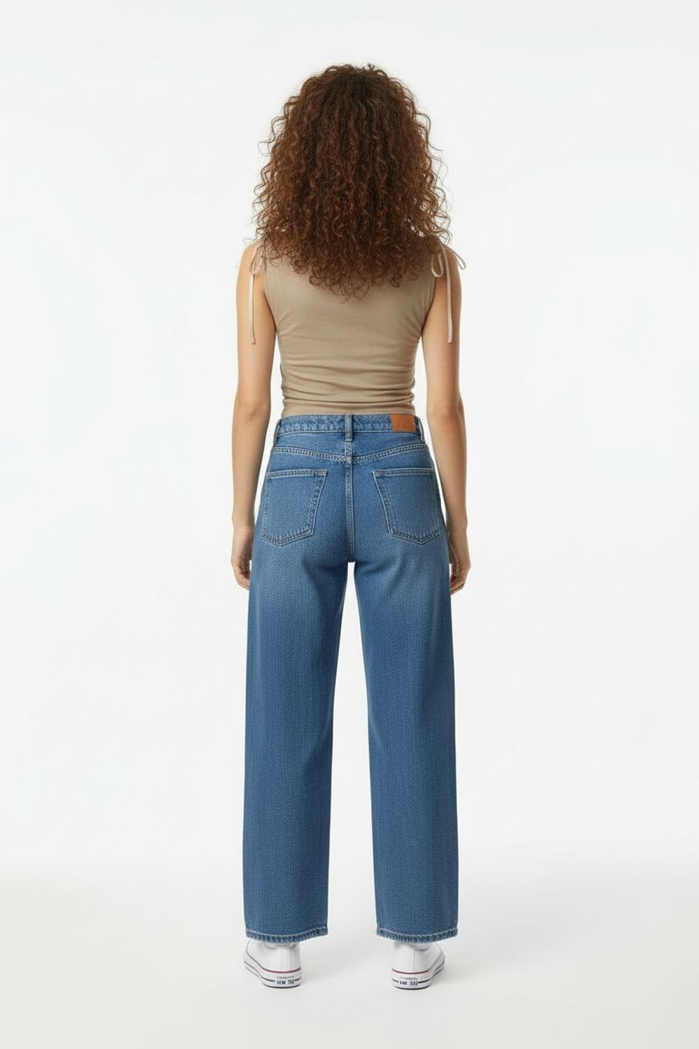 Jeans con pretina con trabillas, cierre frontal con botón y cierre, bolsillos delanteros y traseros, pierna amplia con caída recta, confección rígida