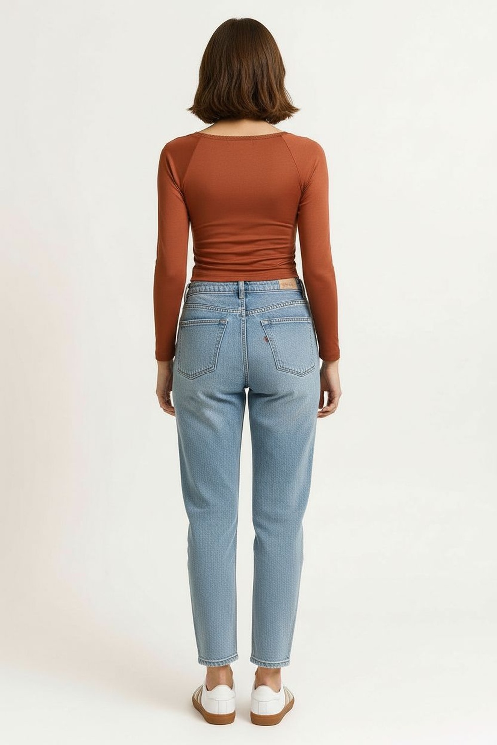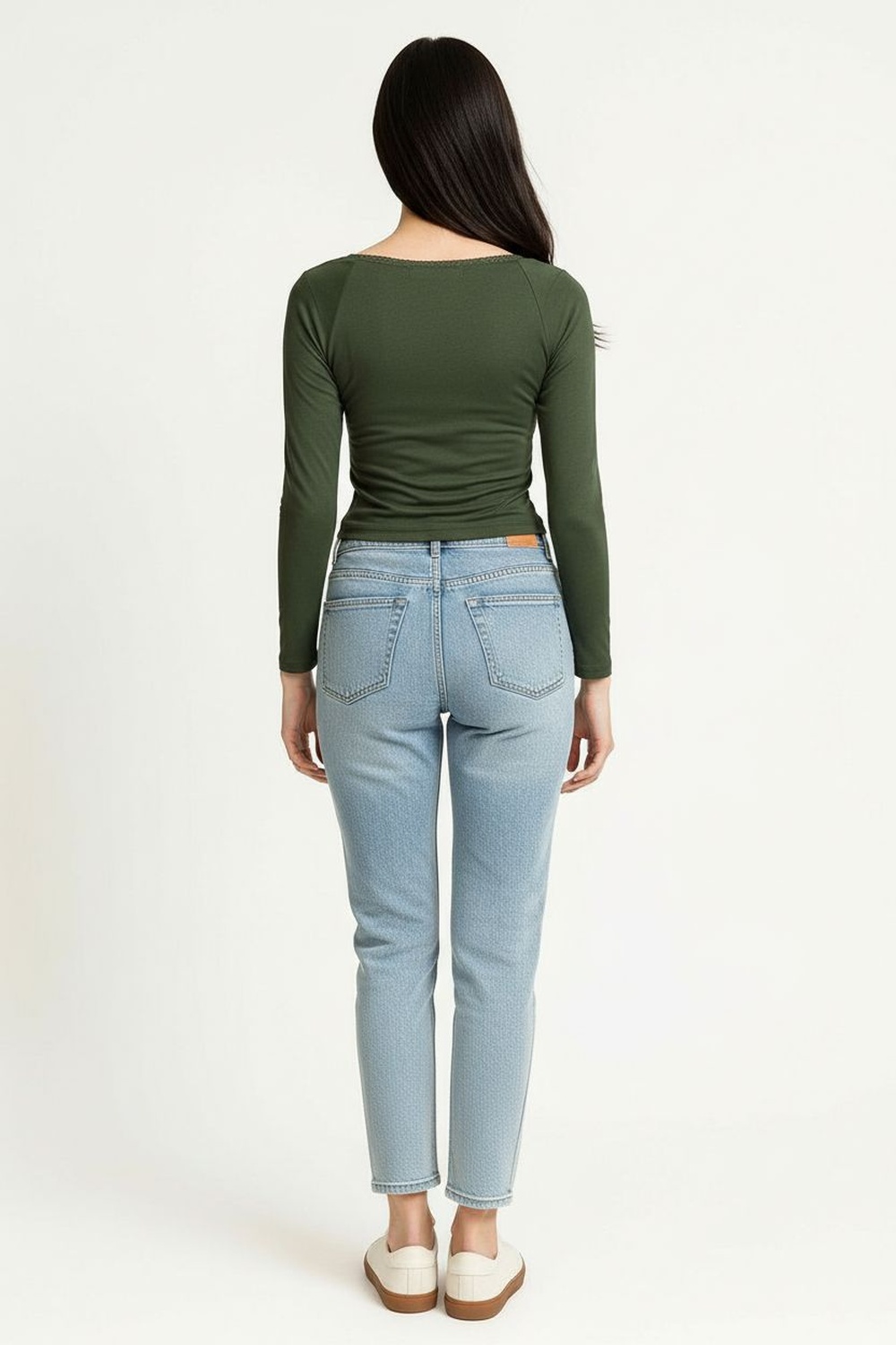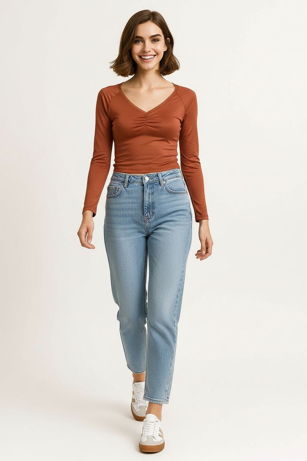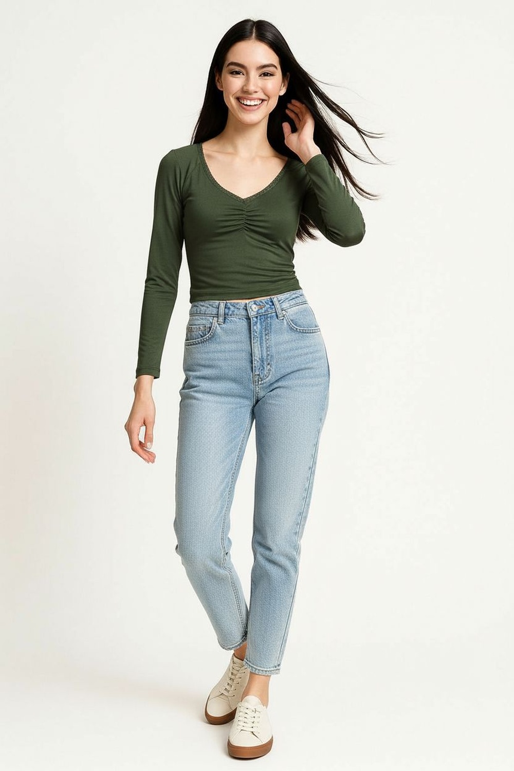 Playera de manga larga con escote en V adornado con detalle de encaje, frunce central que define la parte superior, tejido suave al tacto con caída ligera que aporta frescura, dobladillo recto que ofrece un acabado sencillo y cómodo