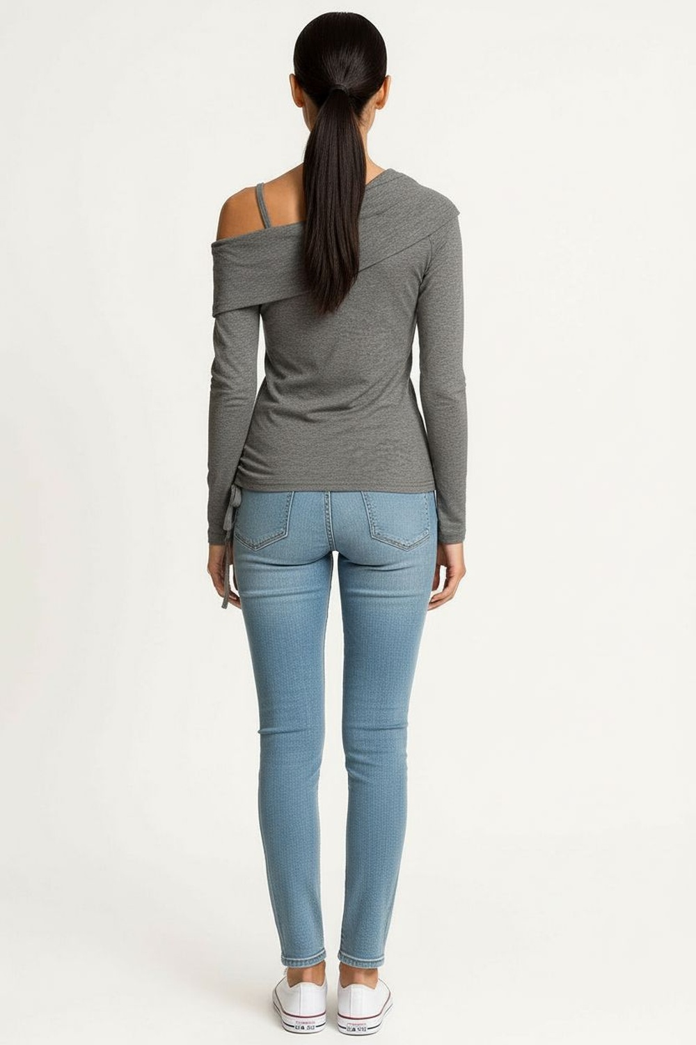 Playera de manga larga con escote amplio que deja hombros descubiertos, ajuste al cuerpo con detalle lateral ajustable, textura ligera que brinda comodidad y movilidad