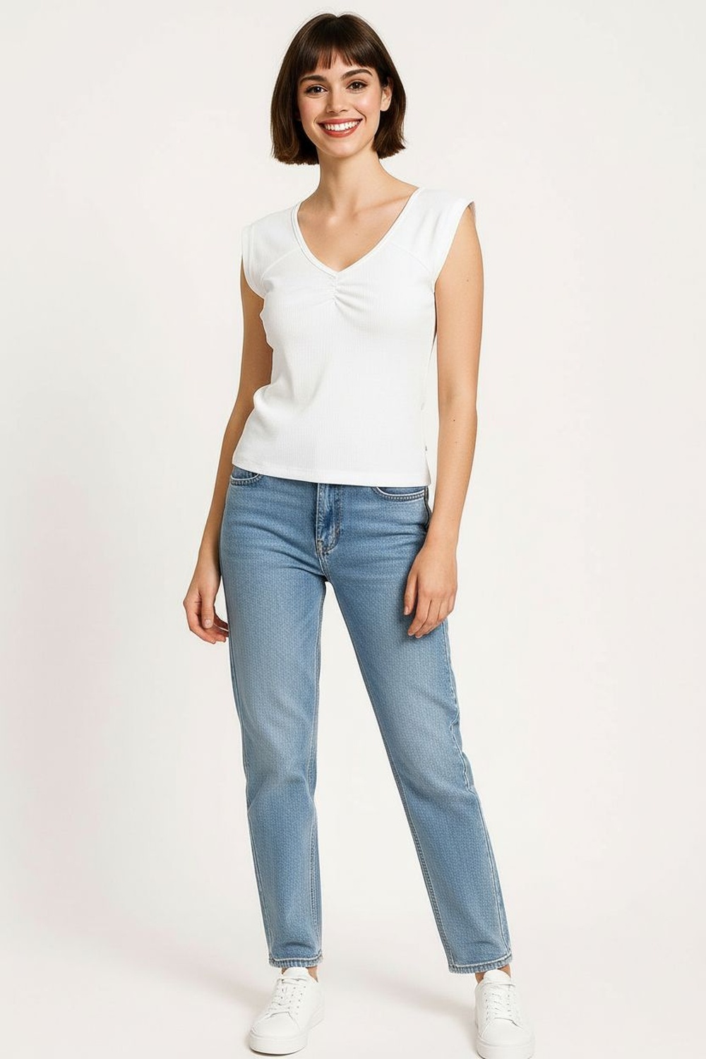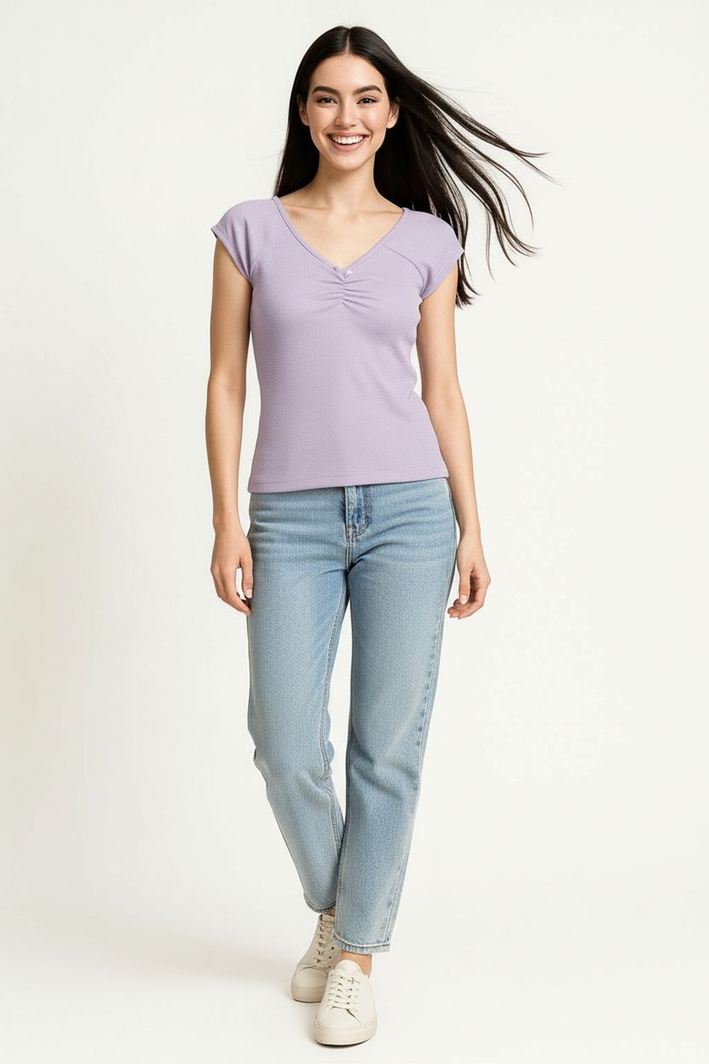 Playera con escote en V y frunce central con aplicación de moño, corte corto que realza la silueta, confección en punto texturizado de tacto ligero y suave que aporta frescura y comodidad