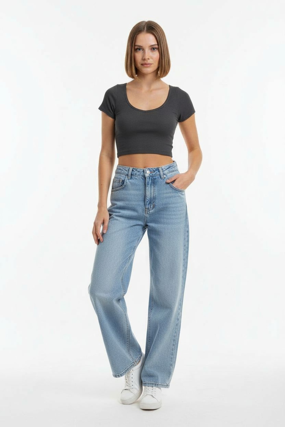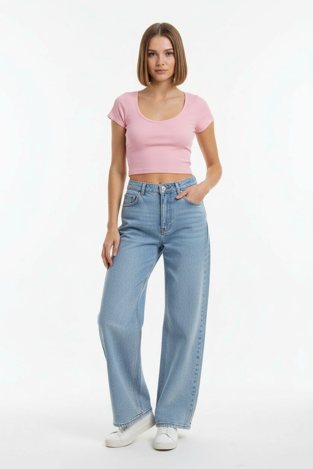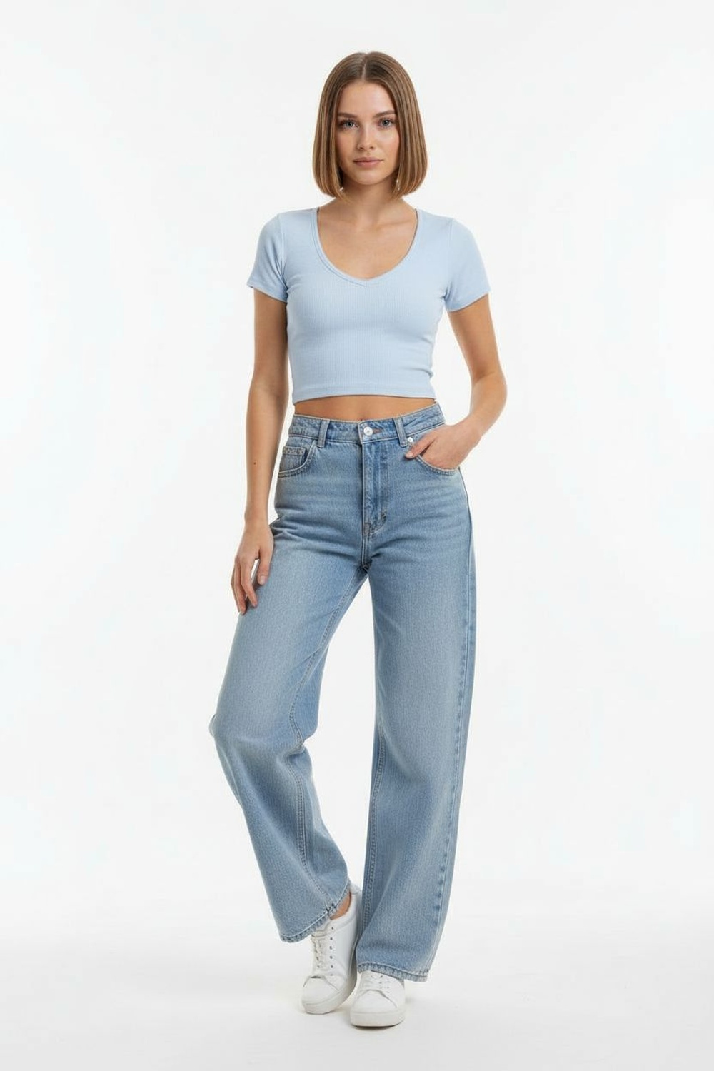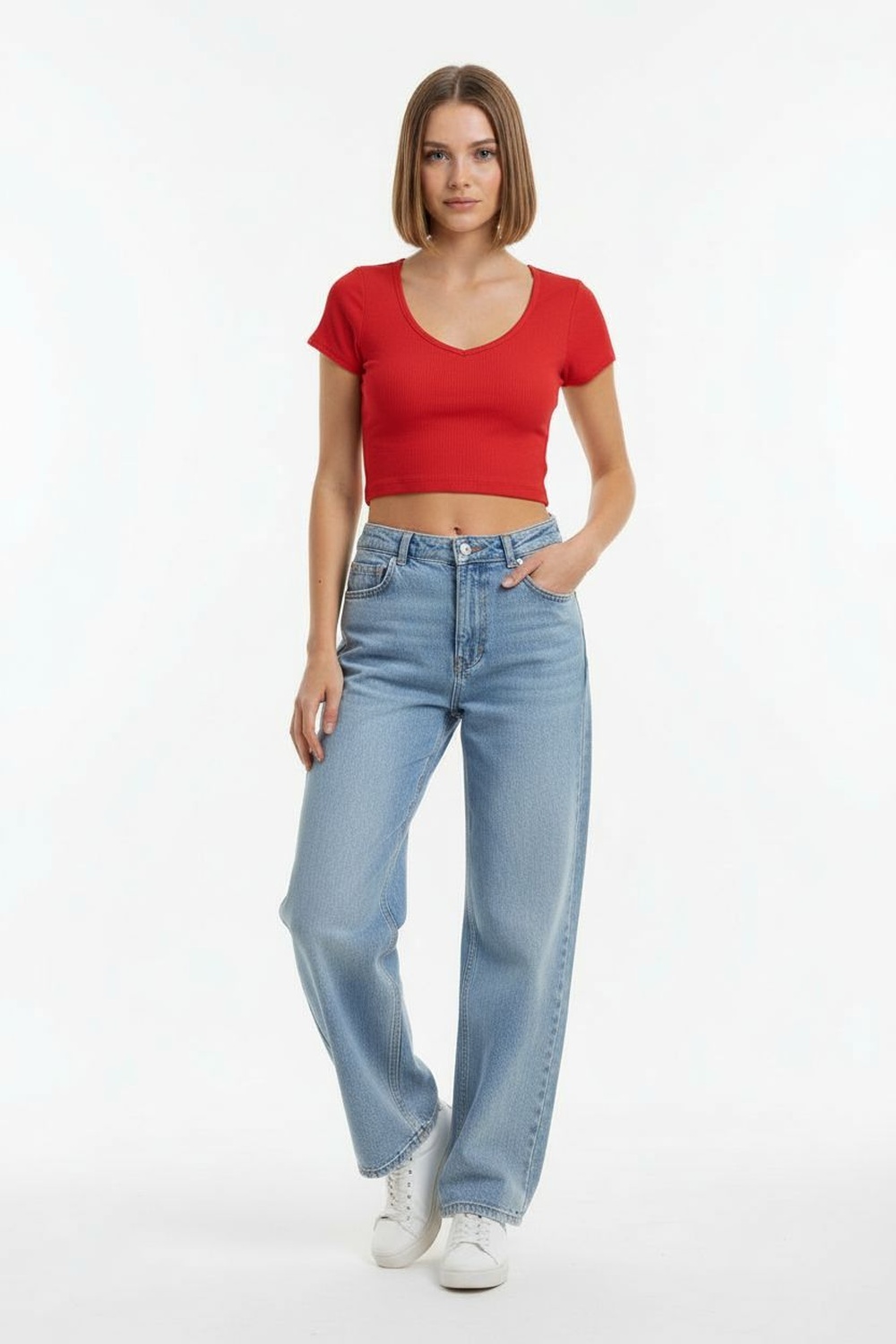 Playera de manga corta con escote en V y tejido tipo rib, ajuste al cuerpo y corte a la cintura