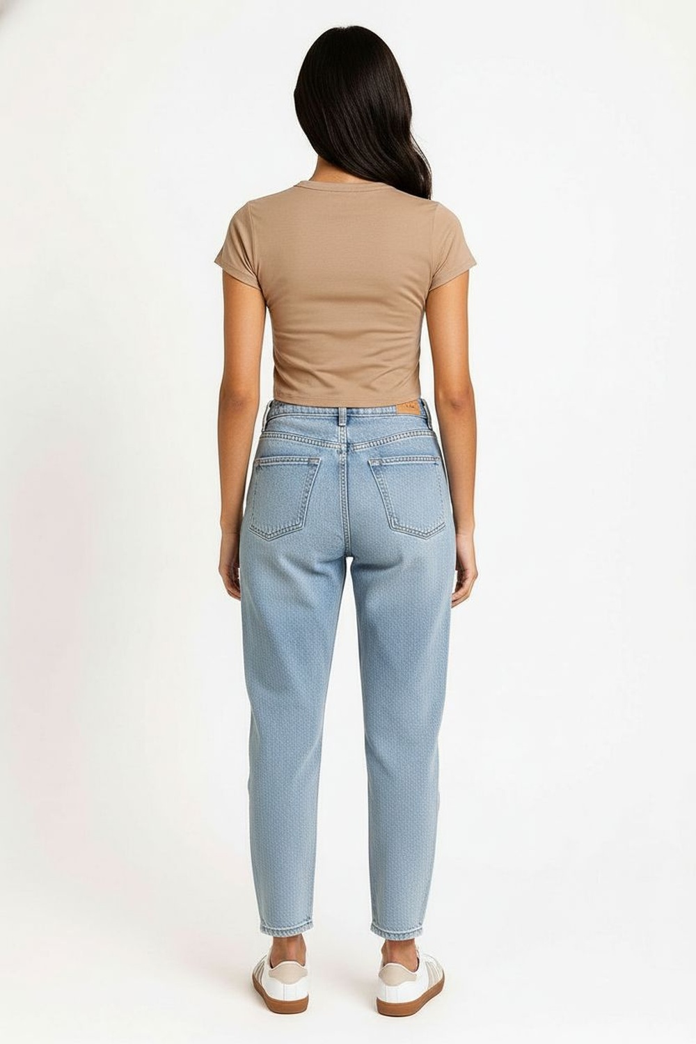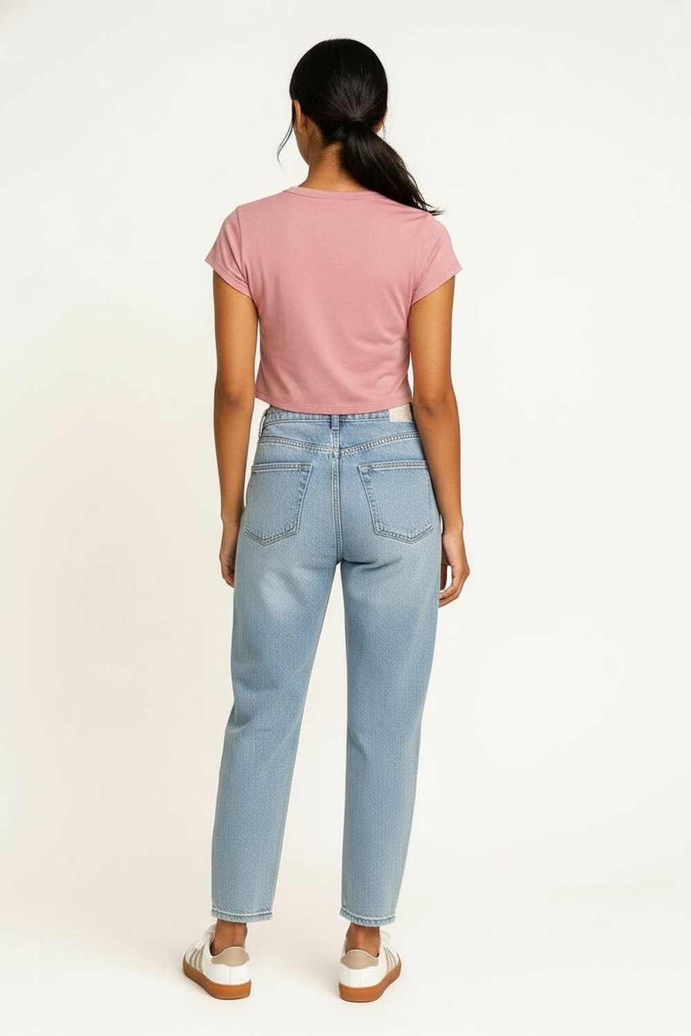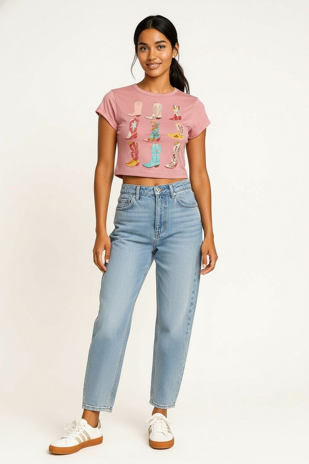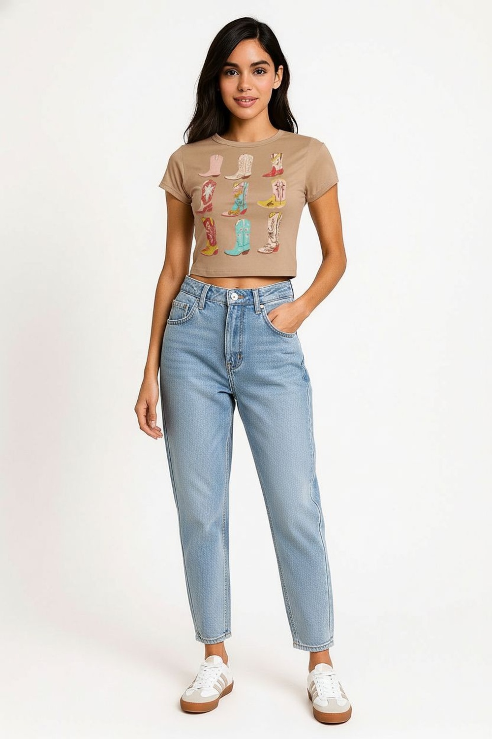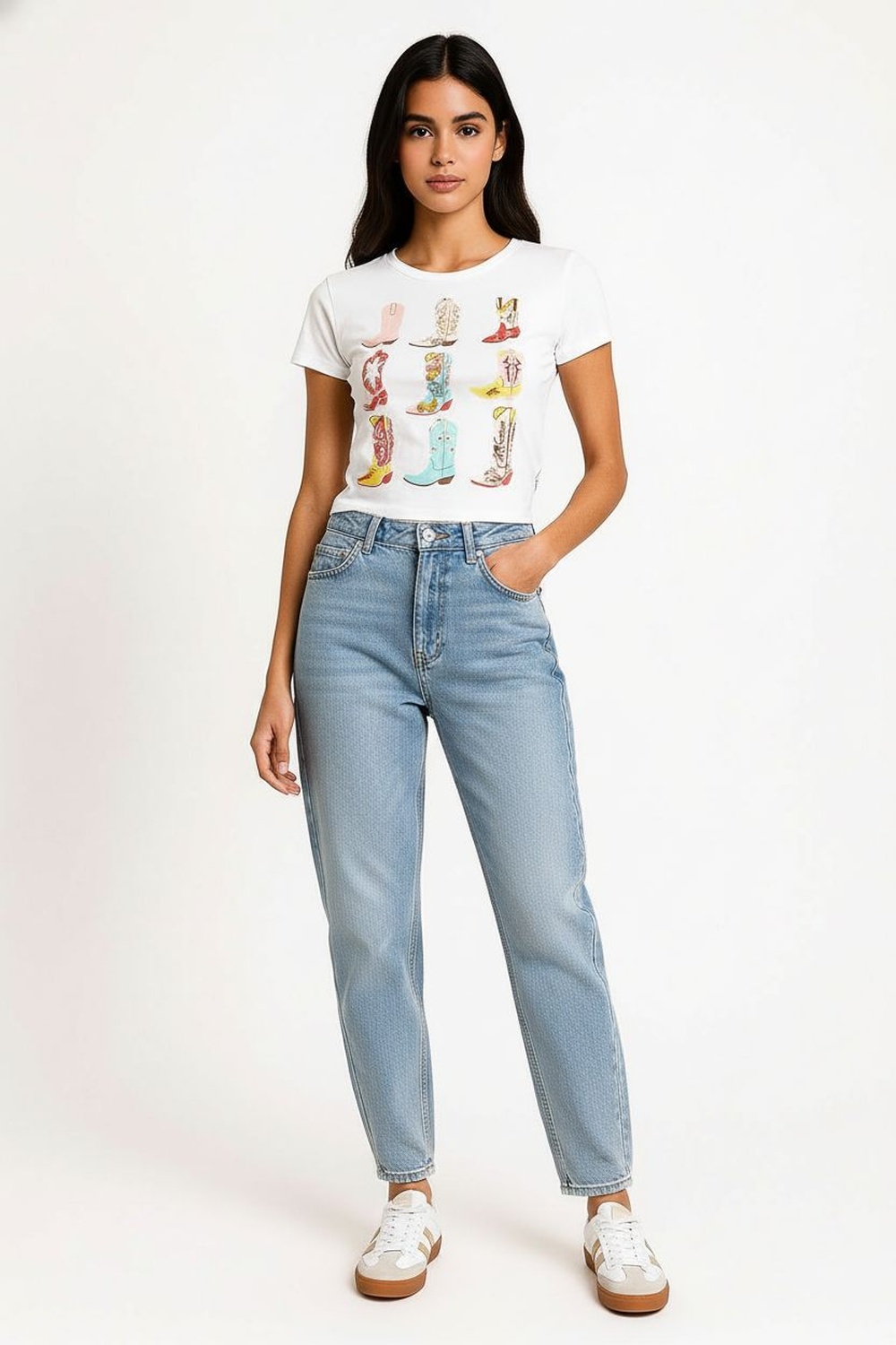 Playera corta confeccionada en punto de algodón con elasticidad natural, estampado al frente con diseño de botas en tonos contrastantes, cuello redondo y manga corta, terminaciones al corte para un look casual y estructurado