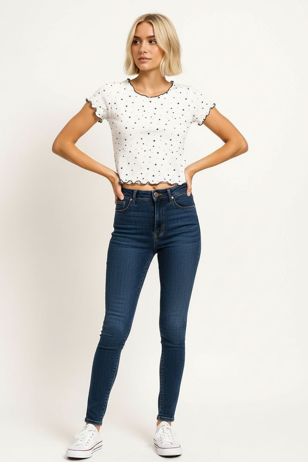 Playera con diseño delicado de acabado festoneado en cuello, mangas y dobladillo que aporta un toque femenino, confeccionada en tejido ligero de punto suave que ofrece comodidad y frescura, cuello redondo clásico que realza el escote, estructura ajustada que define la silueta, bordes contrastantes que destacan el diseño con un estilo moderno