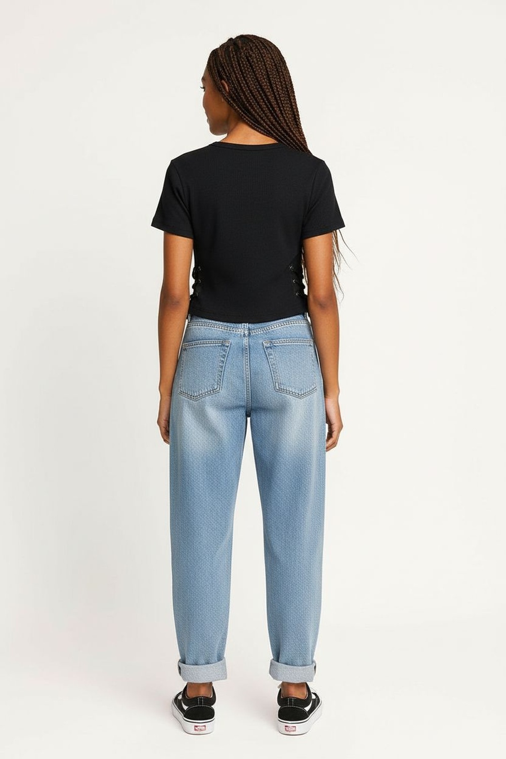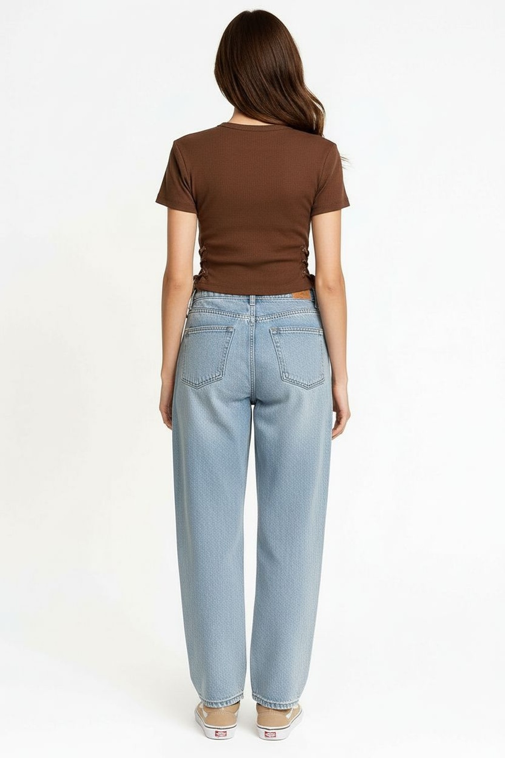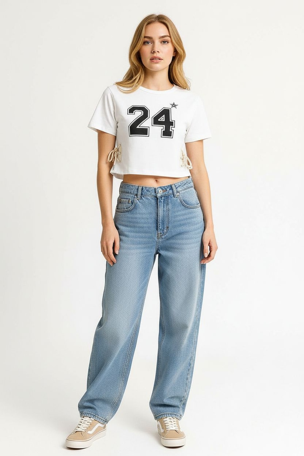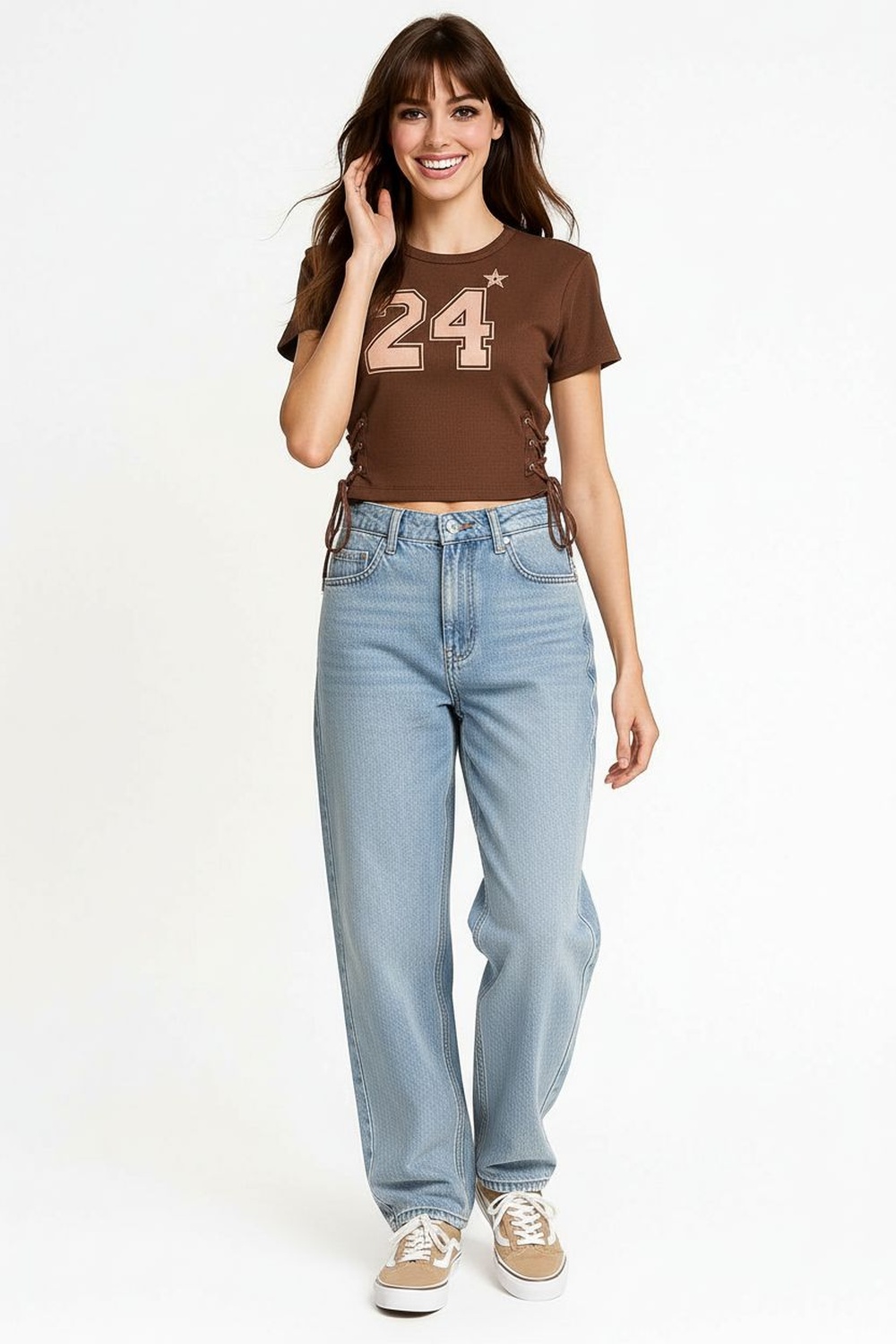 Playera de cuello redondo con aplicación frontal destacada, ajuste lateral mediante amarre para personalizar el entalle, tejido suave de tacto cómodo y estructura que mantiene la forma durante el uso prolongado