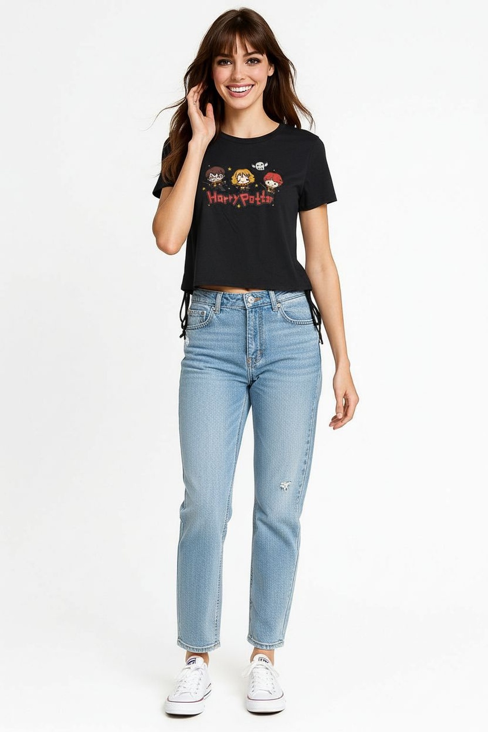 Playera de cuello redondo con ajuste en cintas laterales que permite personalizar la silueta, mangas cortas con terminado limpio y confección en tejido suave de tacto agradable que brinda comodidad durante todo el día, detalle frontal inspirado en personajes icónicos que aporta un toque divertido y juvenil
