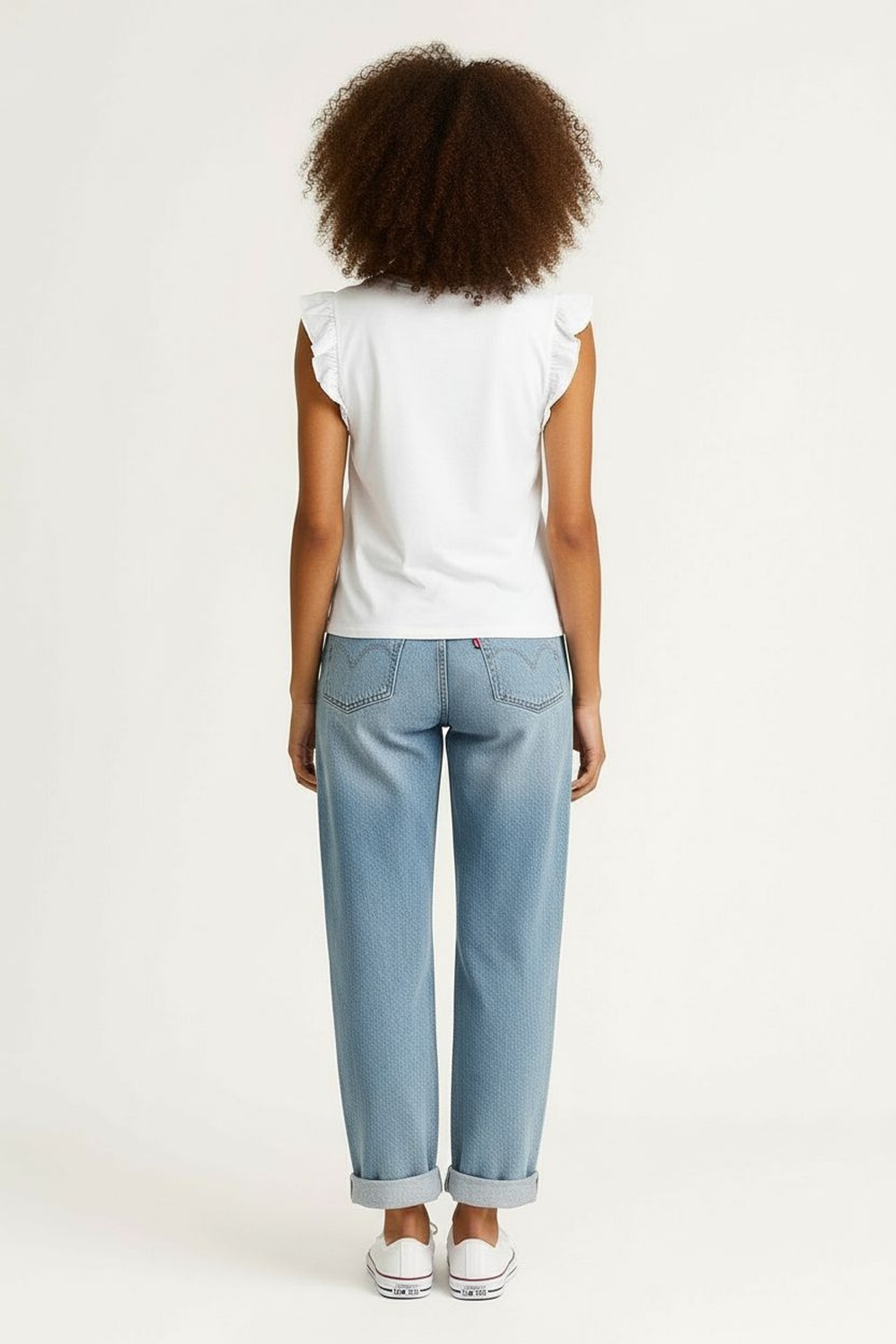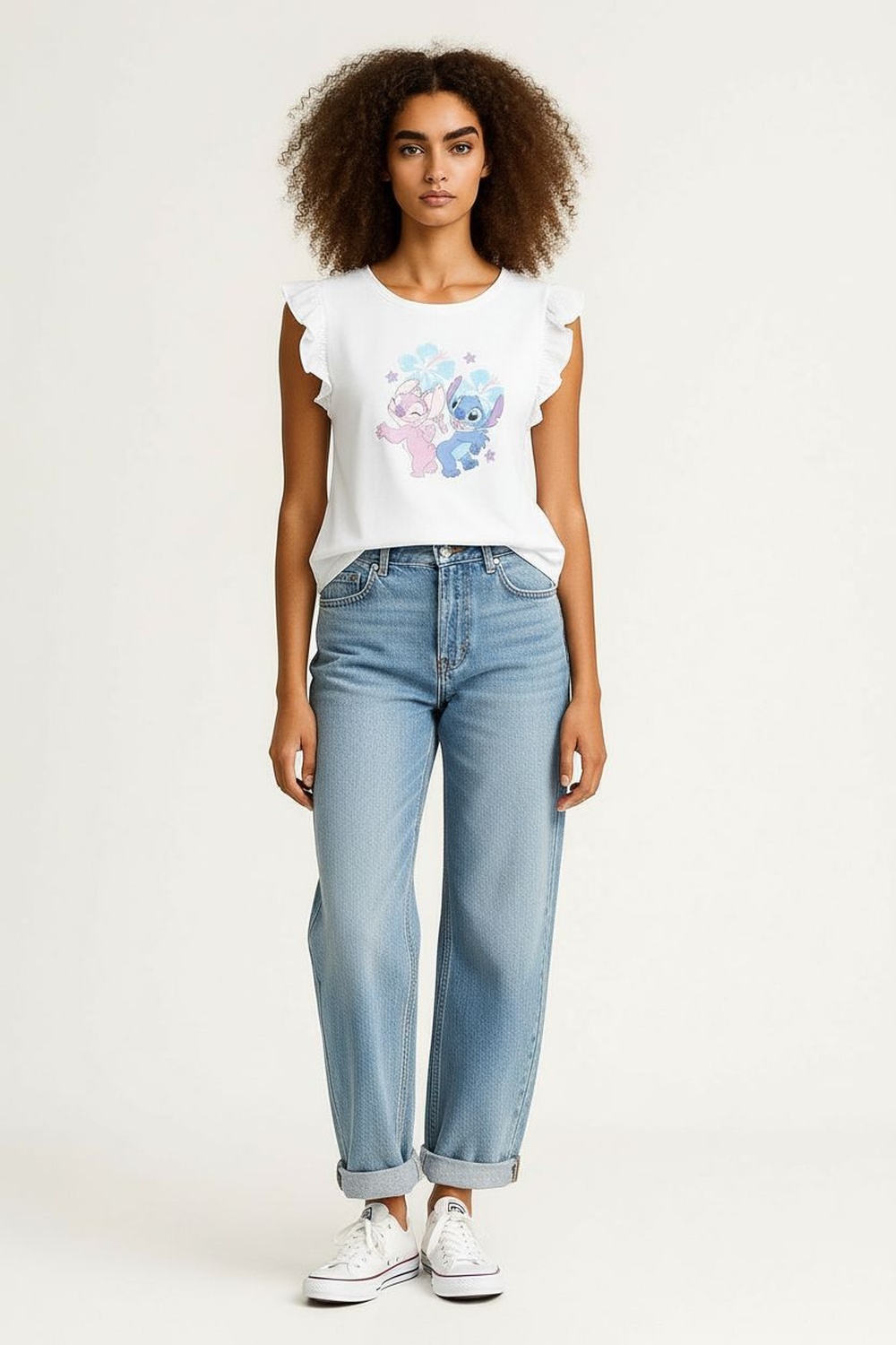 Playera cuello redondo, manga corta con olanes, corte recto, detalle gráfico al frente, textura ligera, ajuste cómodo