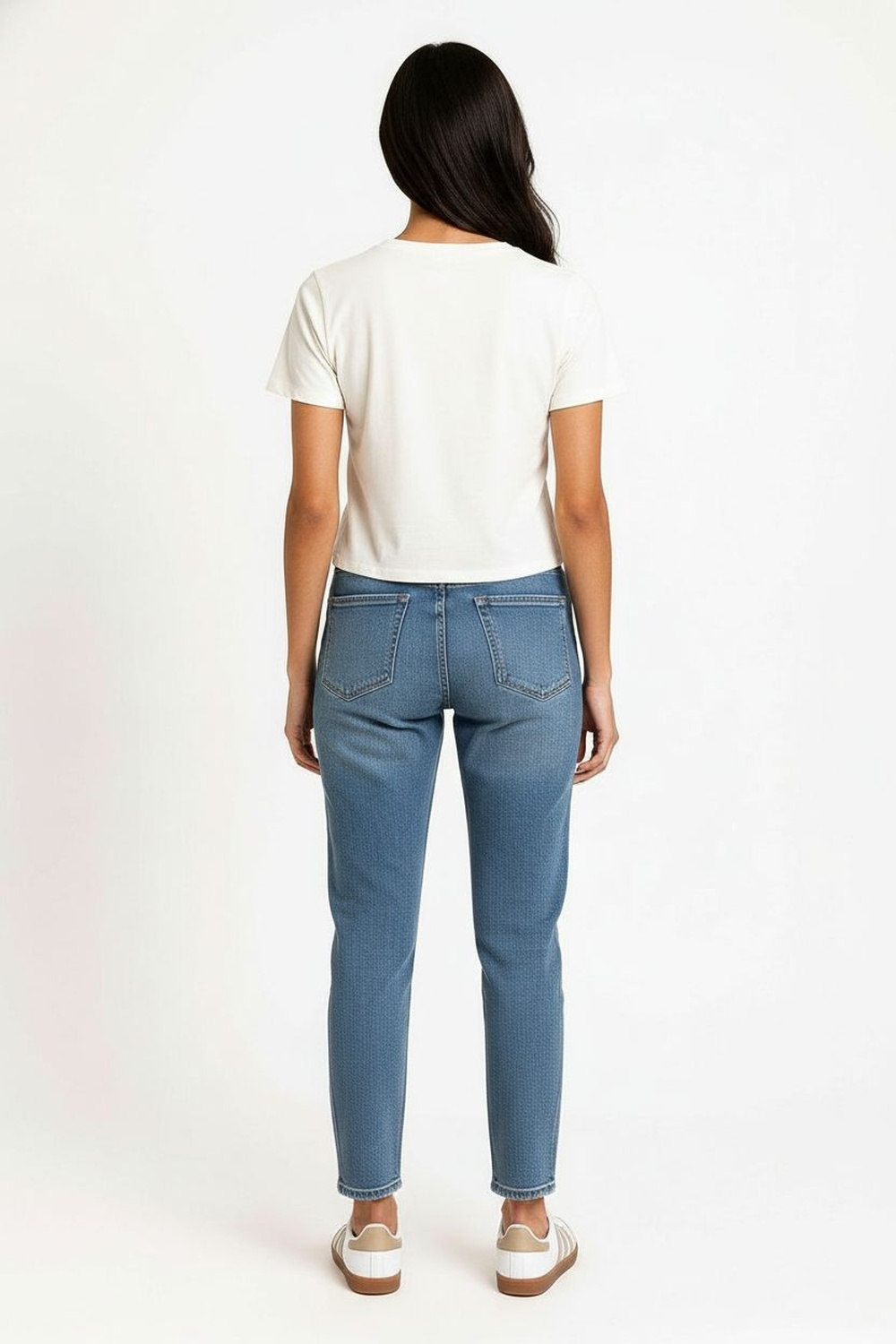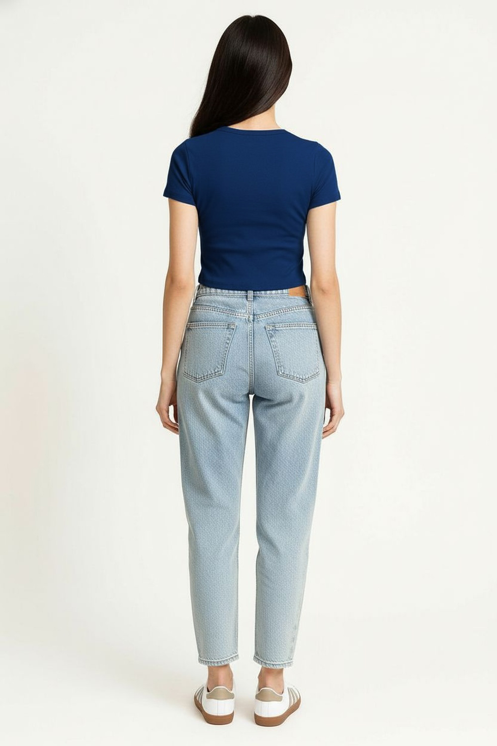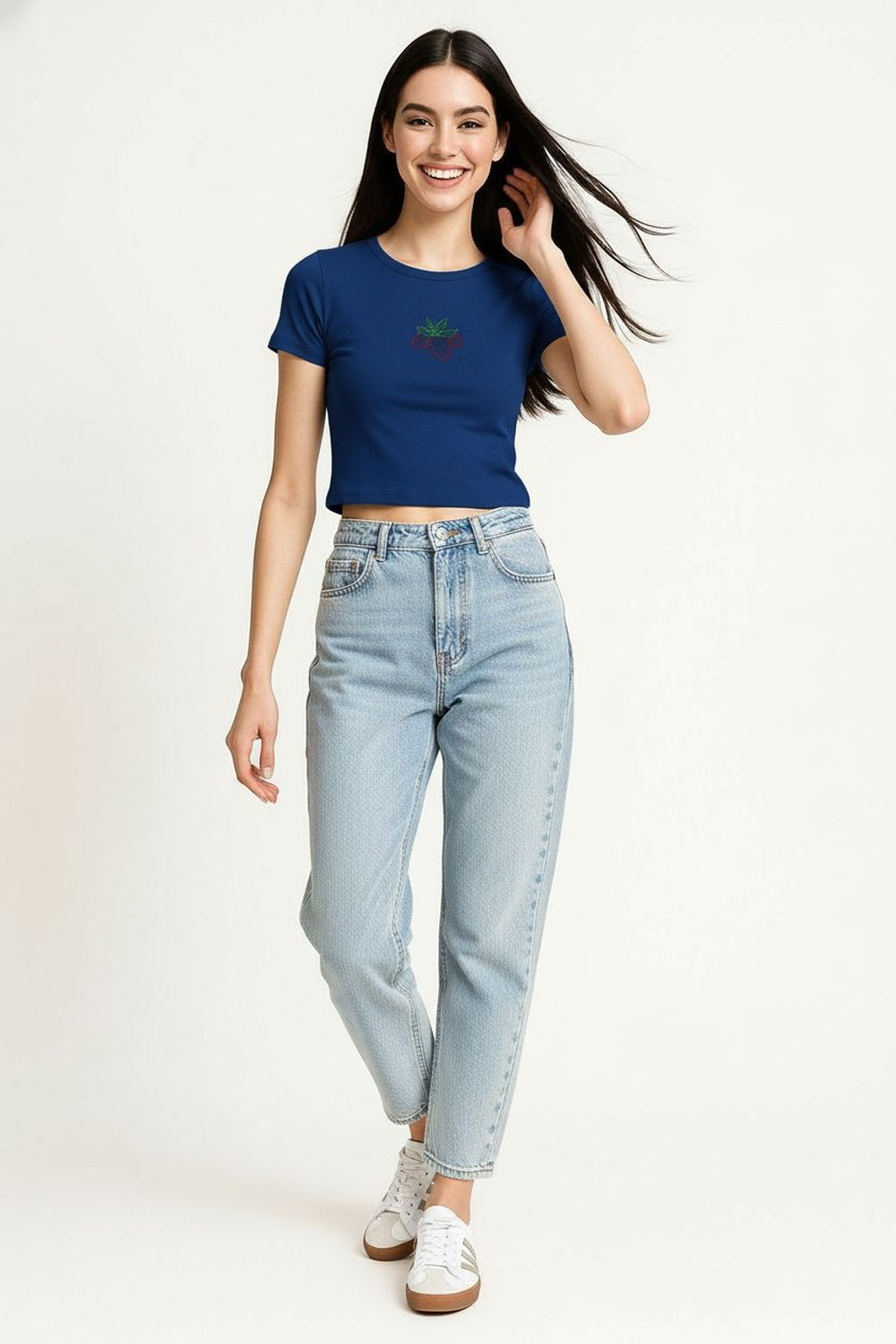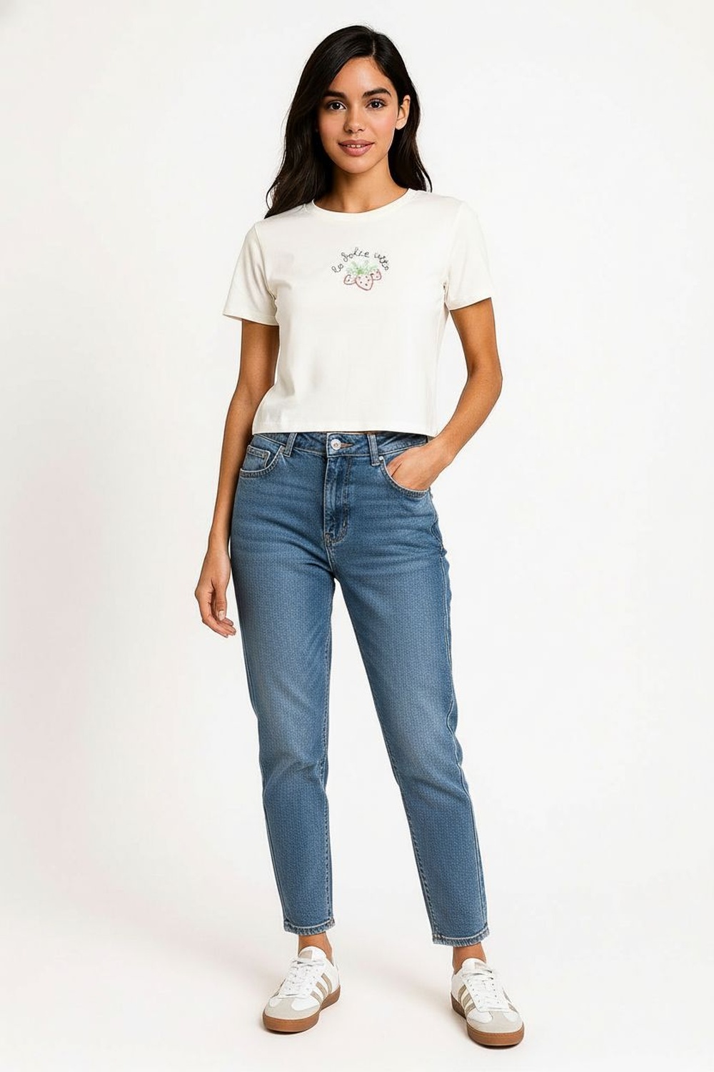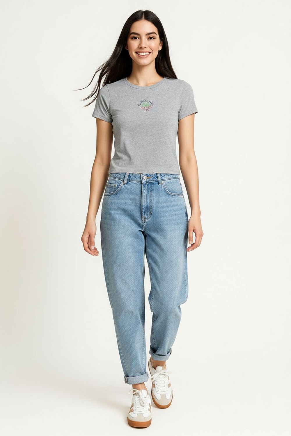Playera corta de manga corta con cuello redondo, confeccionada en tejido suave de tacto cepillado que ofrece comodidad, diseño con estampado frontal que añade un toque juvenil, corte ajustado que resalta la figura, terminaciones limpias que aseguran durabilidad y estilo casual