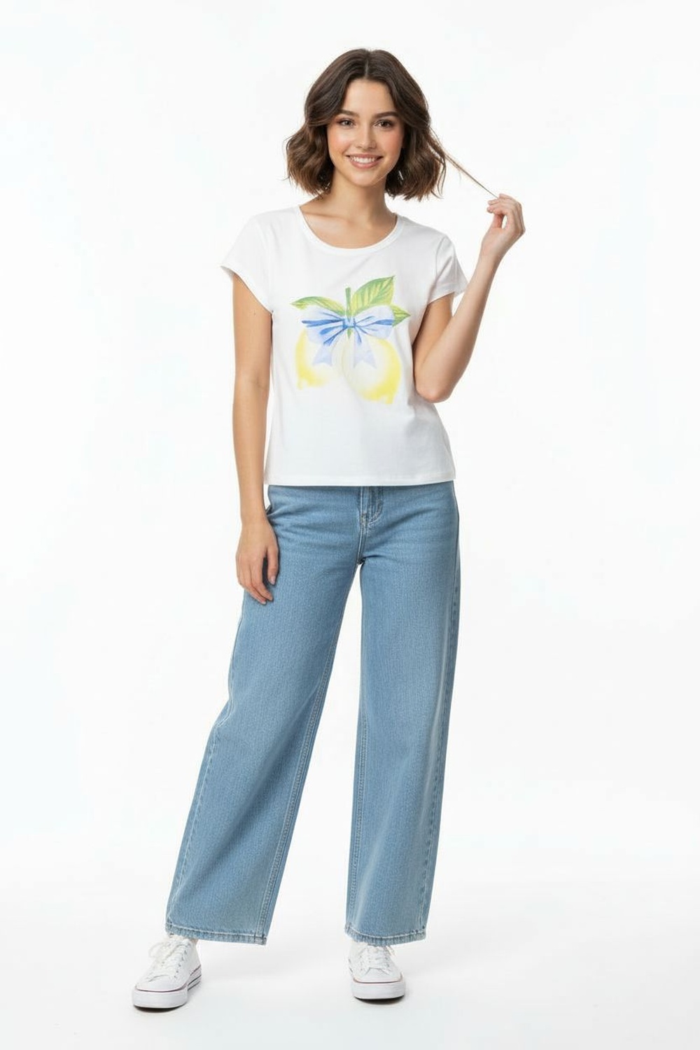 Playera de manga corta, cuello redondo, silueta recta, gráfico decorativo al frente, confección ligera, acabado cómodo para uso diario