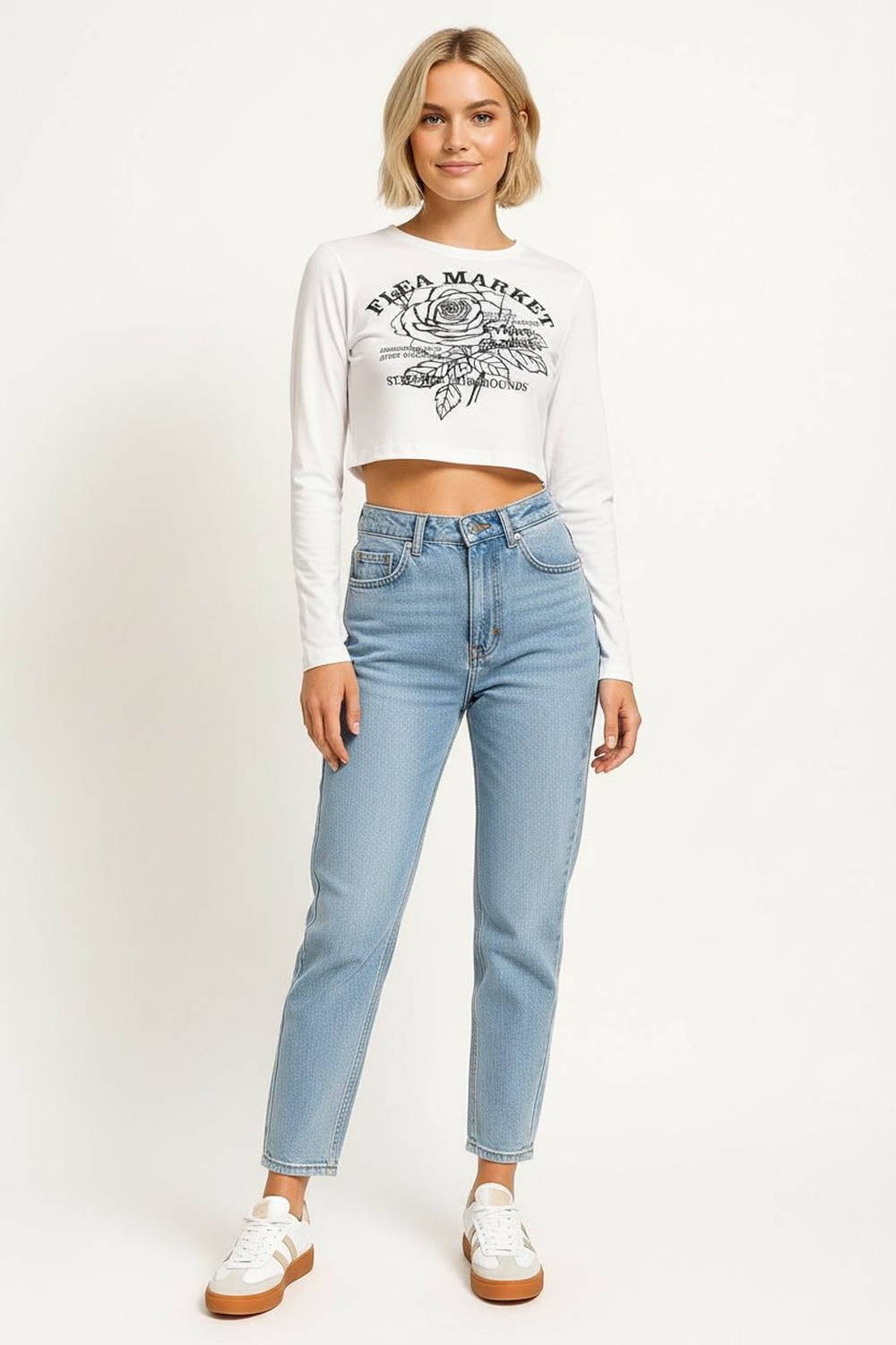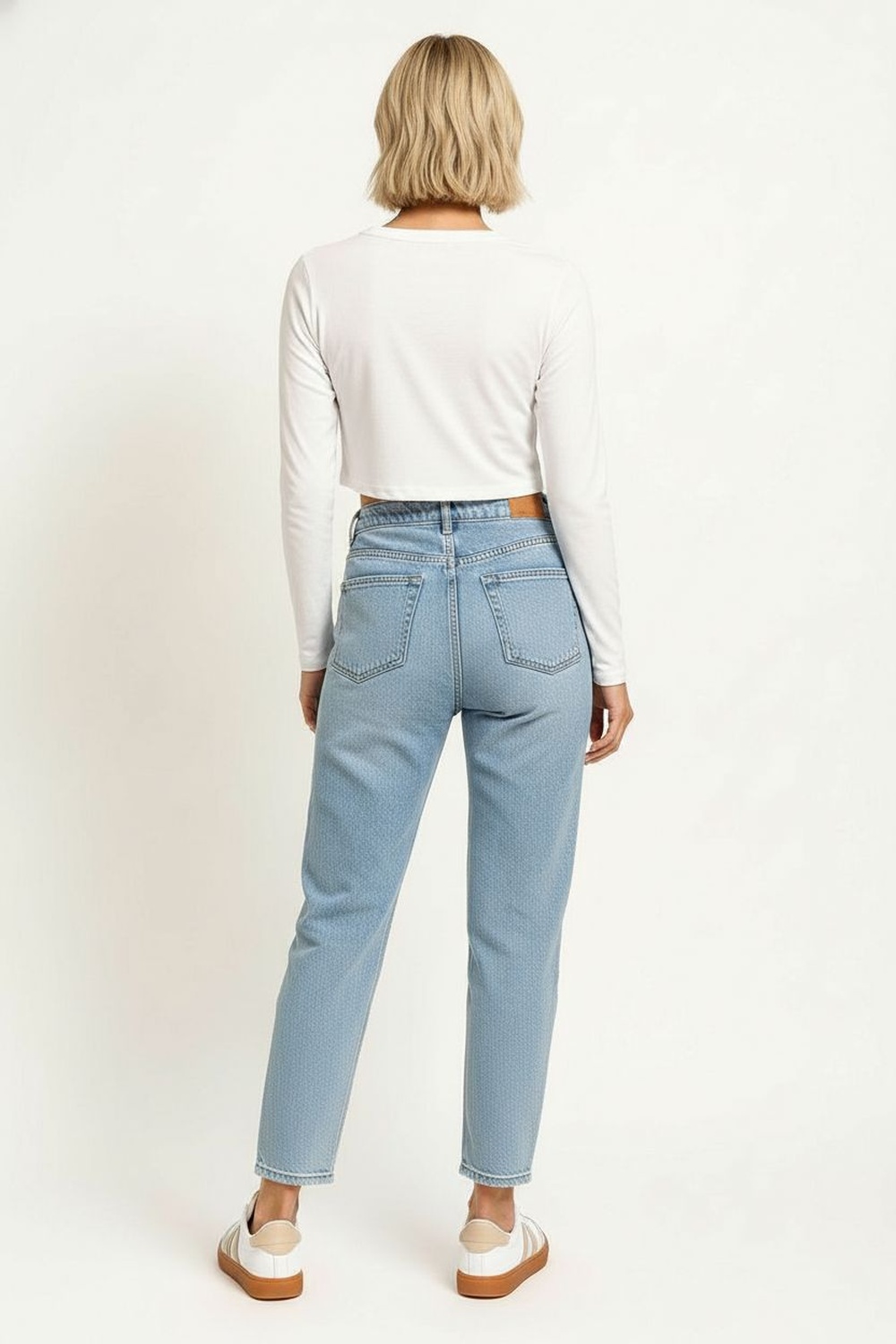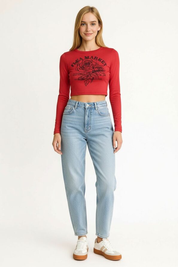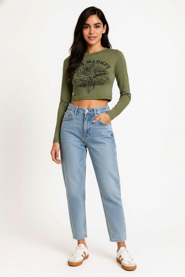 Playera de manga larga con cuello redondo y diseño crop que acentúa la cintura, confeccionada en tejido suave con textura acanalada que aporta comodidad y ajuste, acabado elástico que permite libertad de movimiento y un look moderno
