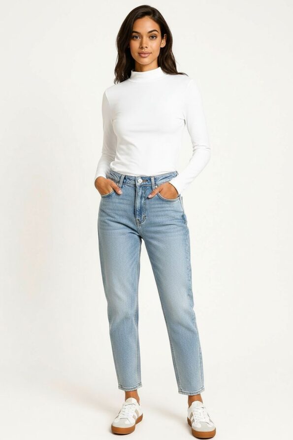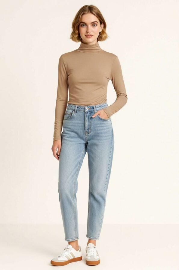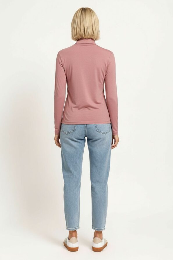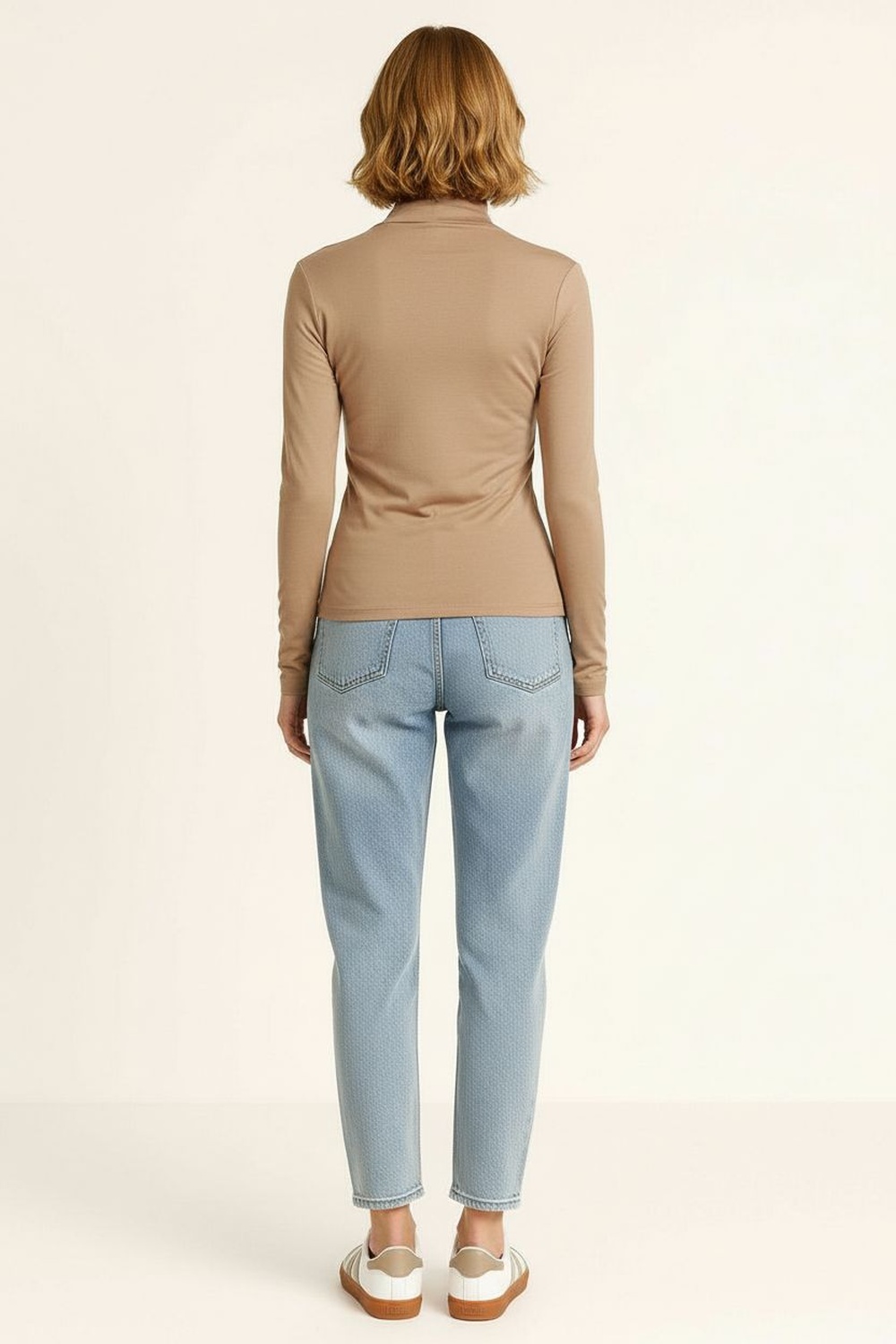 Playera de manga larga con cuello alto que aporta un toque moderno y elegante, diseño ajustado que estiliza la silueta, confección en tejido suave y ligero que brinda comodidad durante todo el día, terminado con bajo recto que permite versatilidad en diferentes combinaciones, ideal para outfits básicos y de temporada