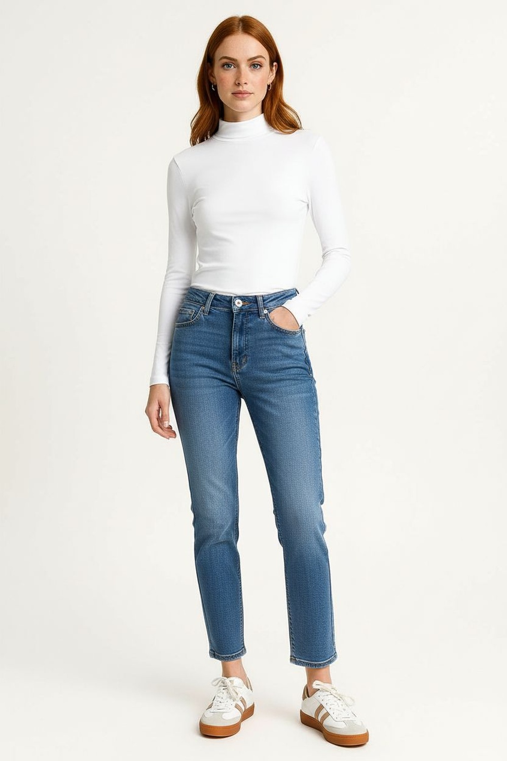 Playera de manga larga con cuello alto que aporta calidez y estilo moderno, corte ajustado que define la silueta y favorece combinaciones con prendas de tiro alto, terminación recta en cintura que brinda un acabado limpio y versátil, confección en tejido suave tipo brush que ofrece confort y ligereza al tacto, ideal para outfits casuales y looks de temporada