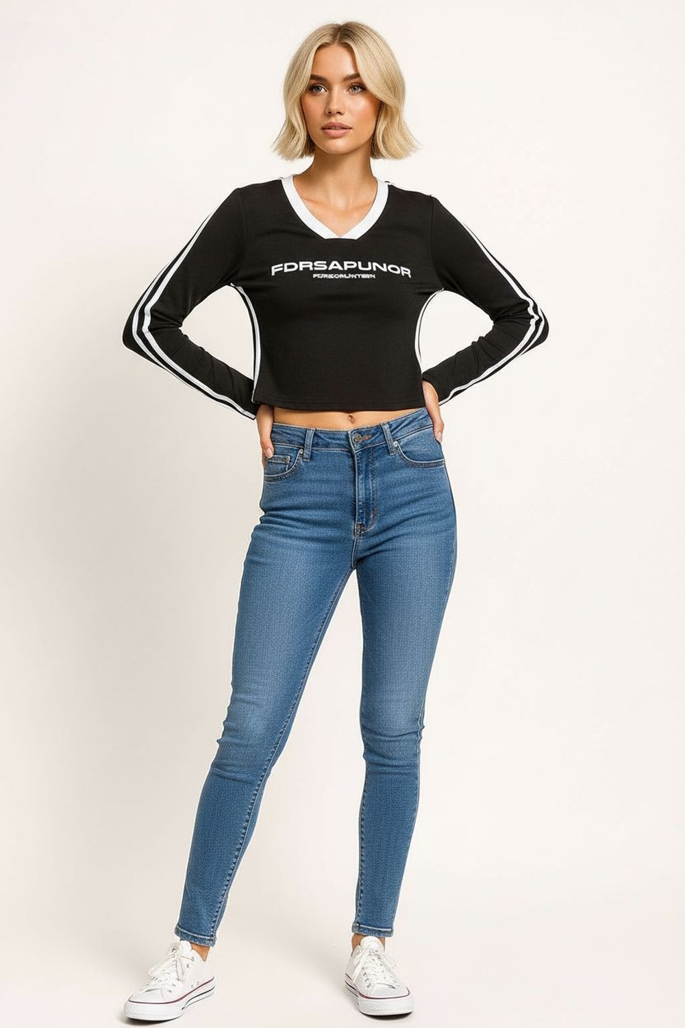Playera de manga larga con escote en V, confeccionada en tejido ligero de tacto suave, aplicación gráfica al frente que aporta carácter, silueta corta con ajuste cómodo, estructura flexible para uso continuo