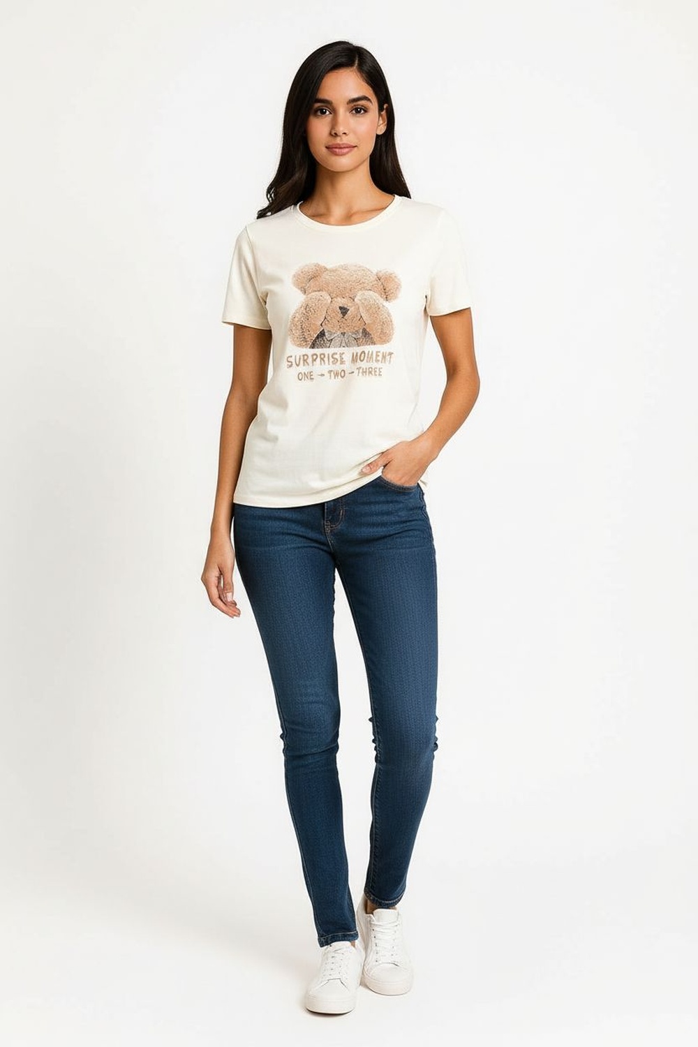 Playera de corte recto con cuello redondo que aporta comodidad y frescura, manga corta clásica que favorece la movilidad, diseño con estampado gráfico de oso que añade un toque divertido y juvenil, confección en tejido de punto suave que brinda ligereza y ajuste relajado, ideal para outfits casuales y combinaciones creativas de temporada