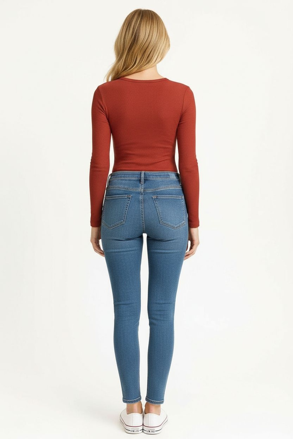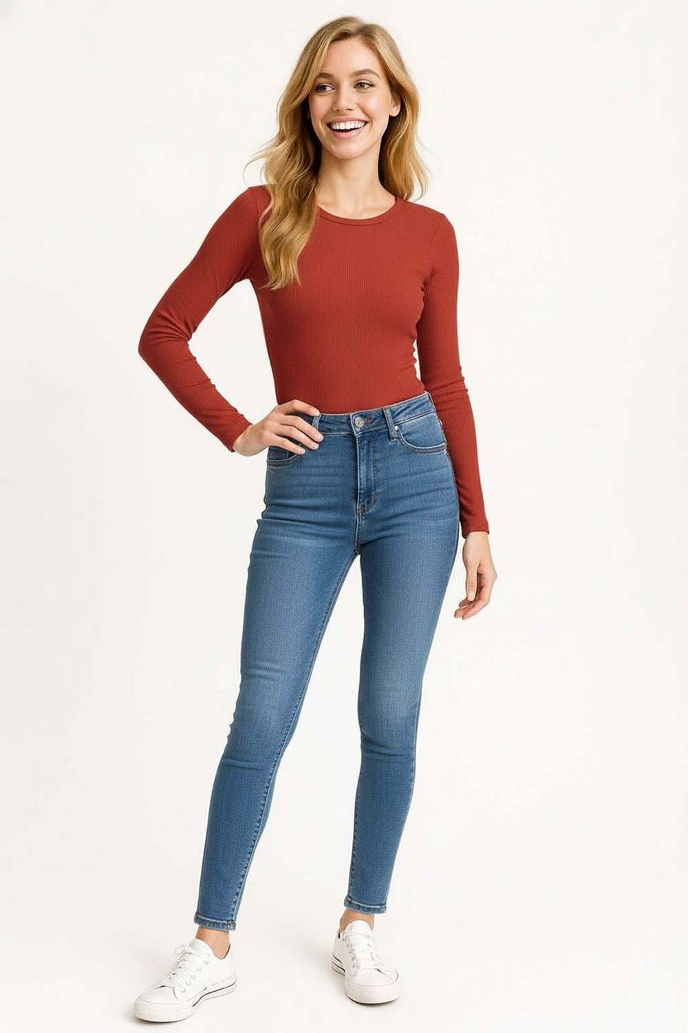 Playera de manga larga con textura rib que aporta elasticidad y ajuste al torso, cuello redondo que acentúa una línea limpia, cierre inferior con broches que asegura sujeción, confección en tejido flexible de alta comodidad