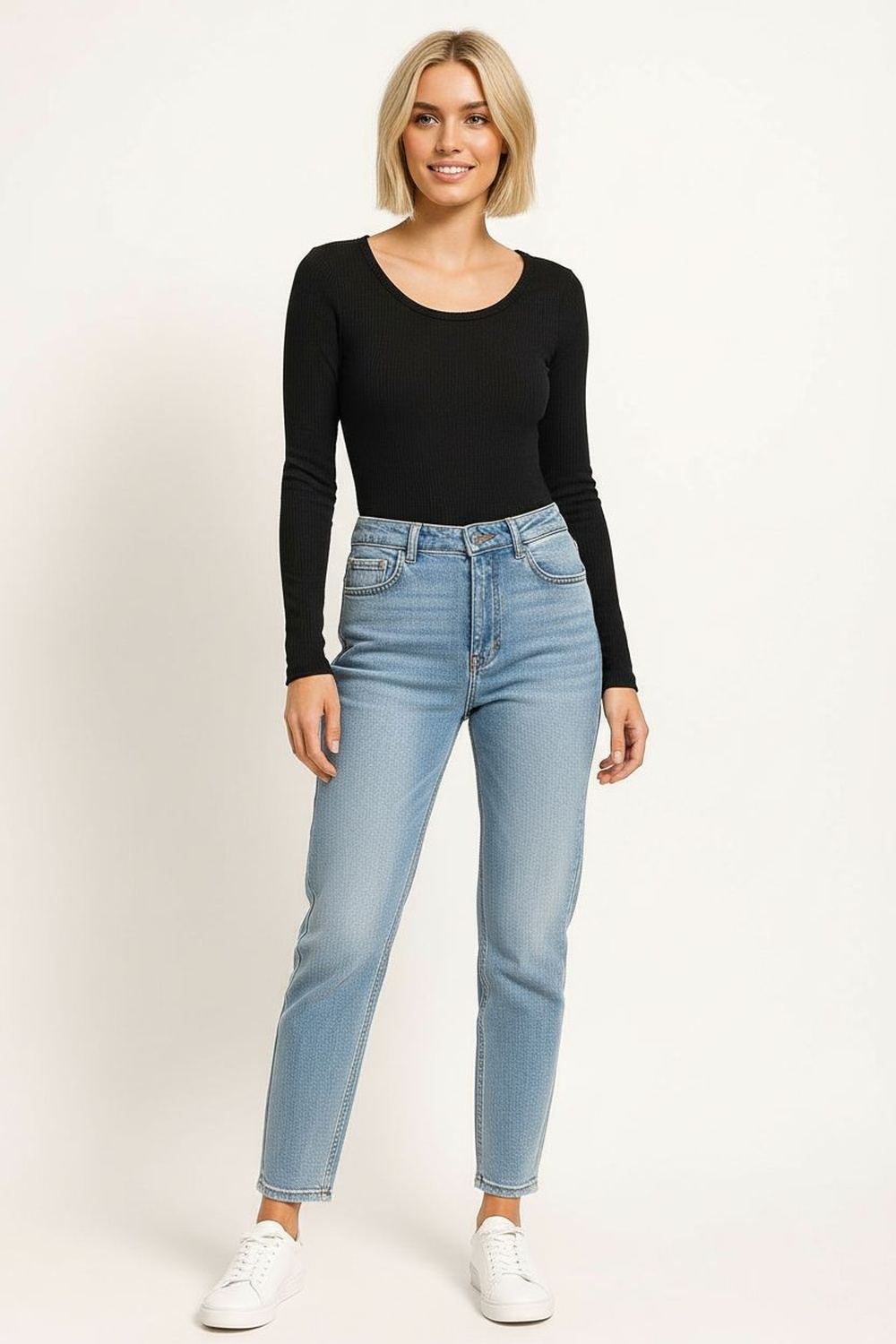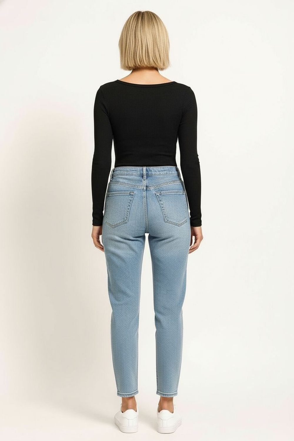 Jeans de tiro alto con estructura rígida que define la silueta, cinco bolsas funcionales que aportan practicidad, costuras visibles que refuerzan el diseño, corte recto que ofrece comodidad al caminar, confección en mezclilla resistente de larga durabilidad