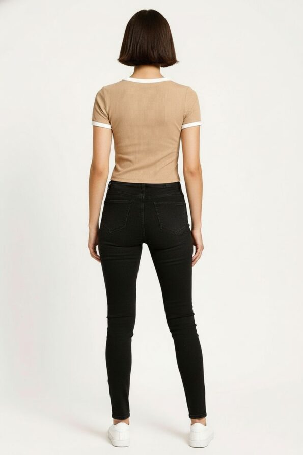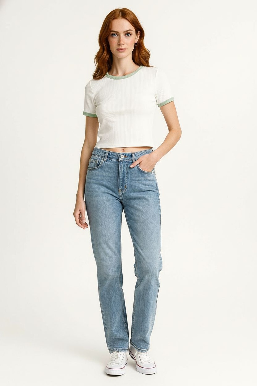 Playera de tejido rib con textura acanalada que aporta un toque moderno, cuello redondo y mangas cortas con bies en contraste que realzan el diseño, confección en material elástico que ofrece suavidad y comodidad, corte corto que equilibra la silueta, terminaciones limpias que mantienen una apariencia pulida y contemporánea