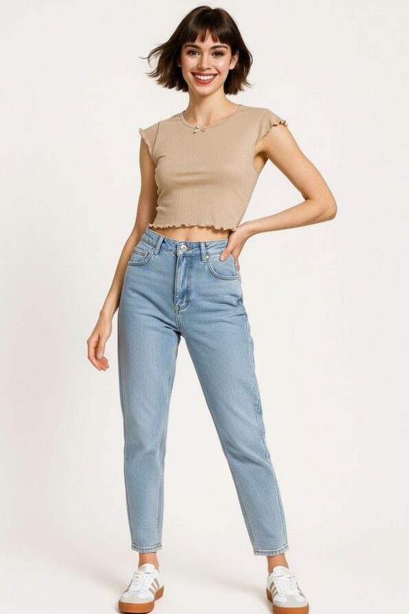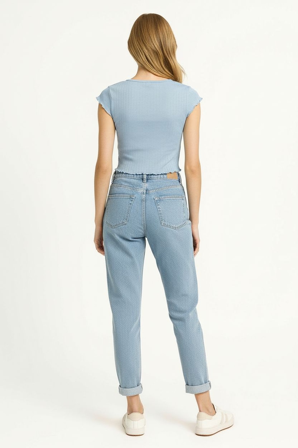 Playera de tejido rib con silueta desahujada que aporta comodidad y estilo relajado, escote redondo con detalle de moño al frente que añade un toque delicado, manga tipo kimono que permite libertad de movimiento, terminado ondulado en el bajo que resalta el diseño moderno y femenino