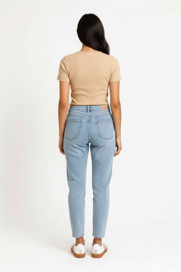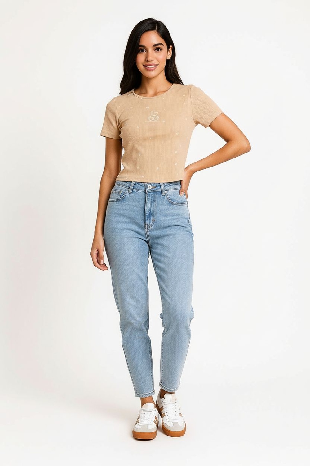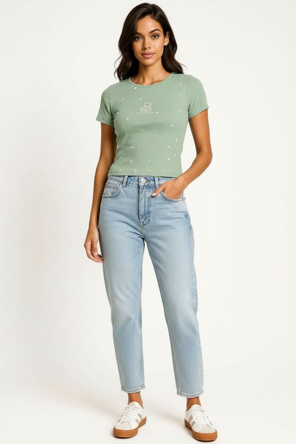 Suéter corto de manga corta confeccionado en tejido de viscosa acanalado que se ajusta suavemente al cuerpo, cuello redondo con acabado limpio que aporta equilibrio al diseño, textura elástica que ofrece comodidad y libertad de movimiento, diseño moderno y versátil ideal para looks casuales de temporada