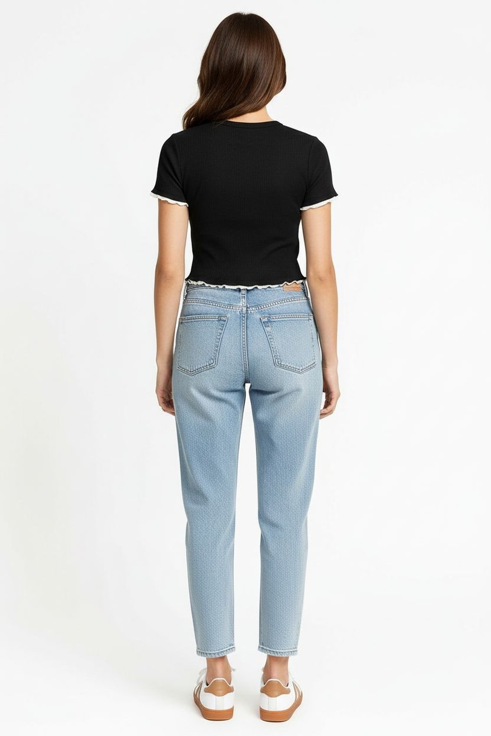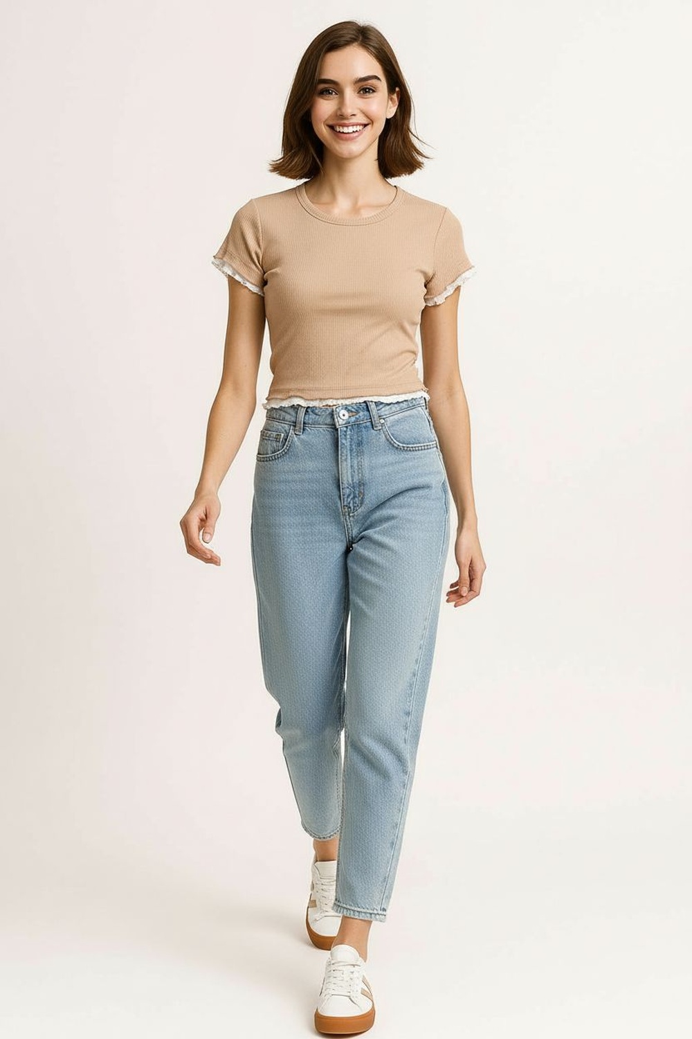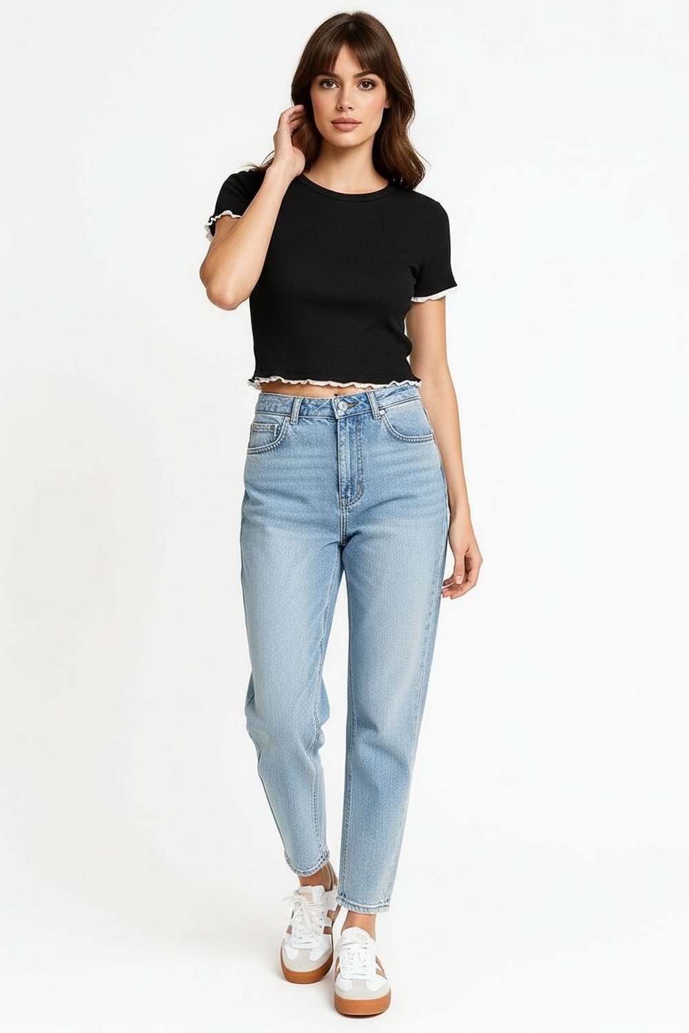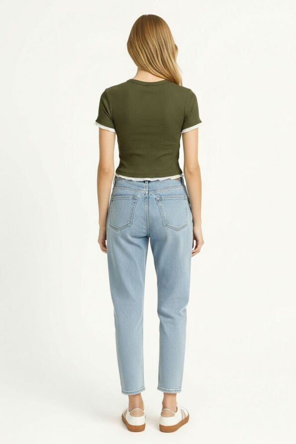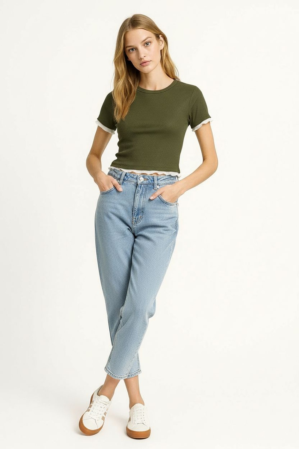 Playera de tejido rib con diseño festoneado que simula doble prenda, escote redondo con terminación limpia que aporta suavidad al contacto con la piel, manga corta con detalle ondulado que añade un toque moderno, confección elástica que favorece el movimiento y resalta la figura