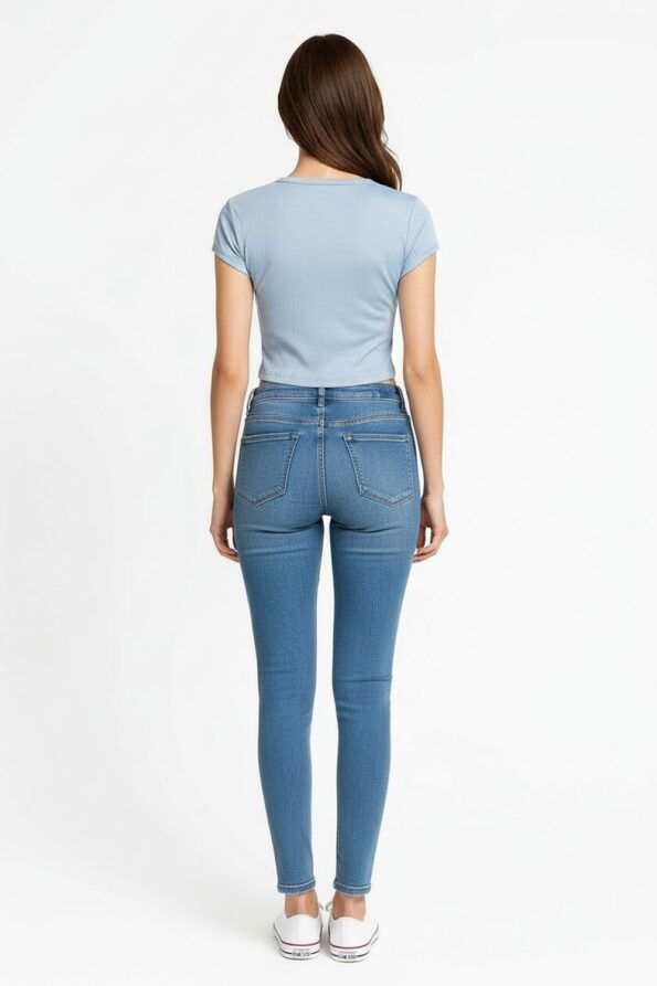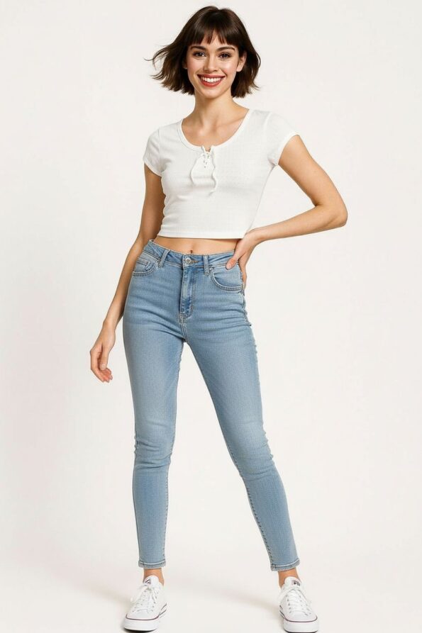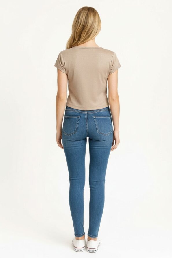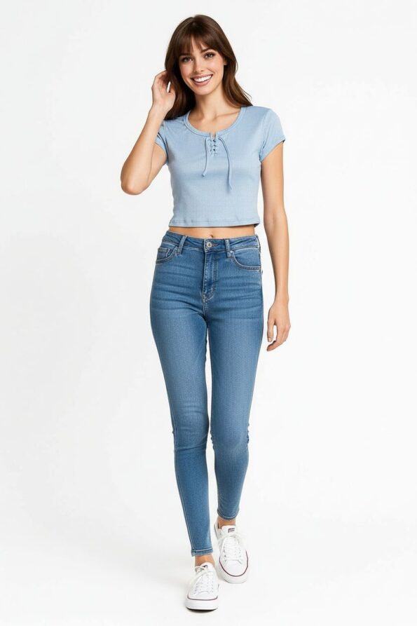 Playera de manga corta confeccionada en tejido rib de textura acanalada que aporta elasticidad y comodidad, diseño con jareta frontal ajustable que permite definir el escote, corte corto que realza la cintura, cuello redondo con terminación suave y costuras planas que aseguran un acabado limpio y moderno