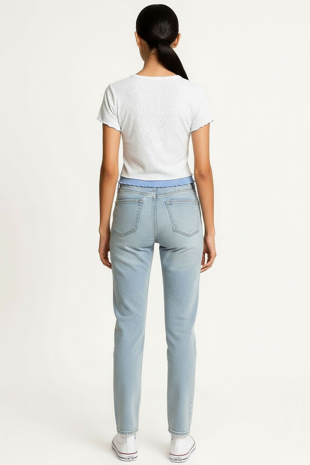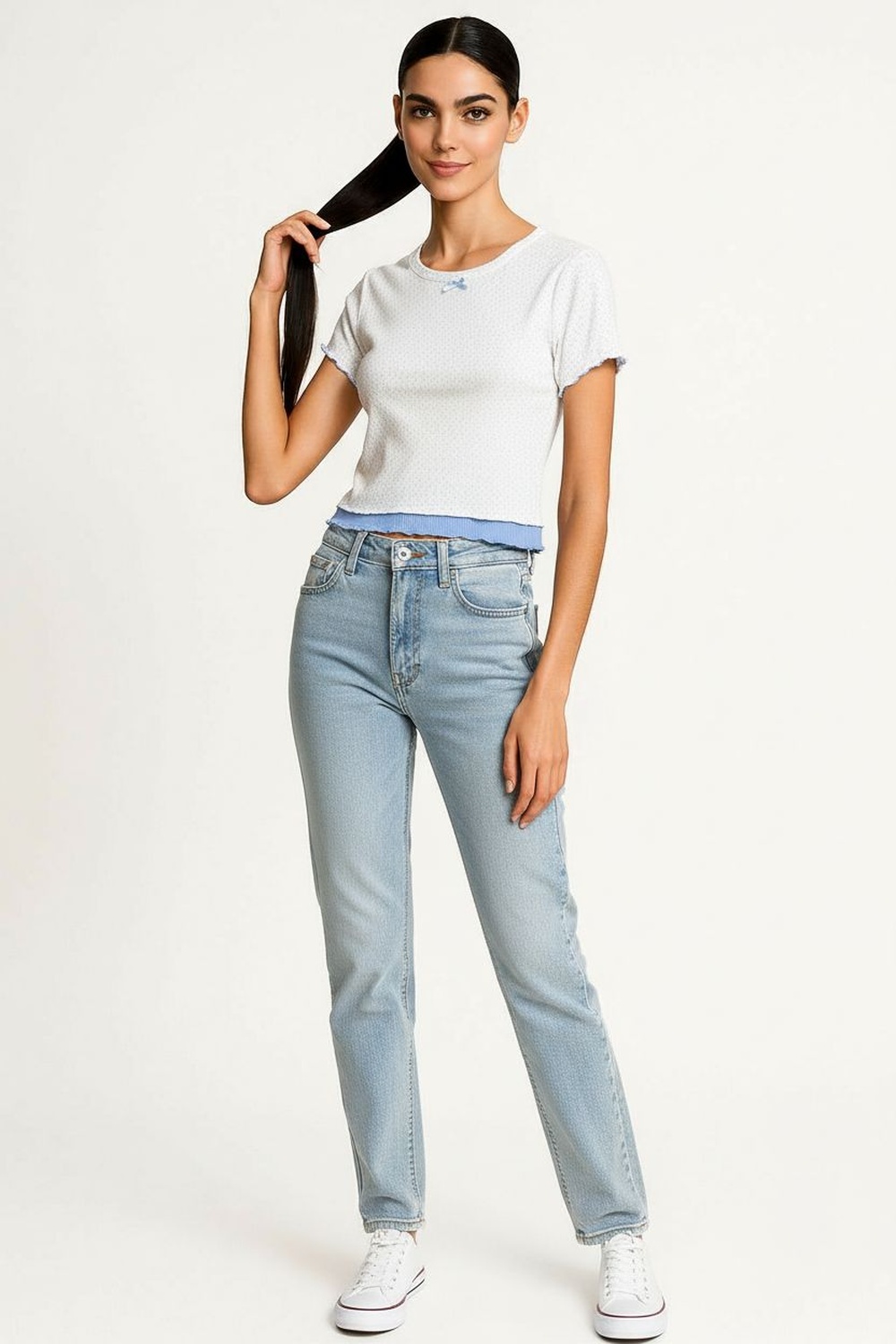 Playera rib manga corta con cuello redondo, detalle de moño decorativo al frente, tejido acanalado, ajuste al cuerpo, terminación recta