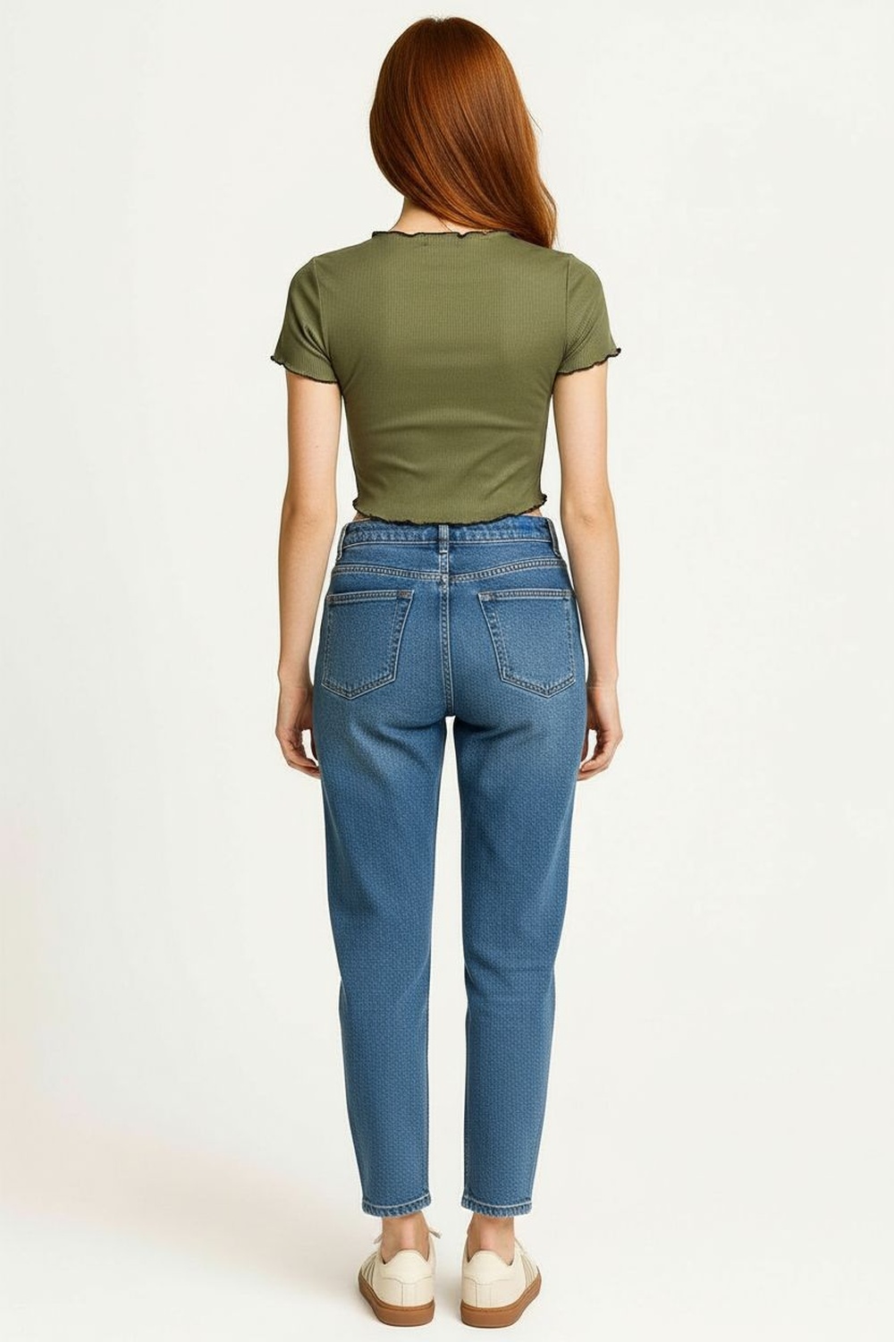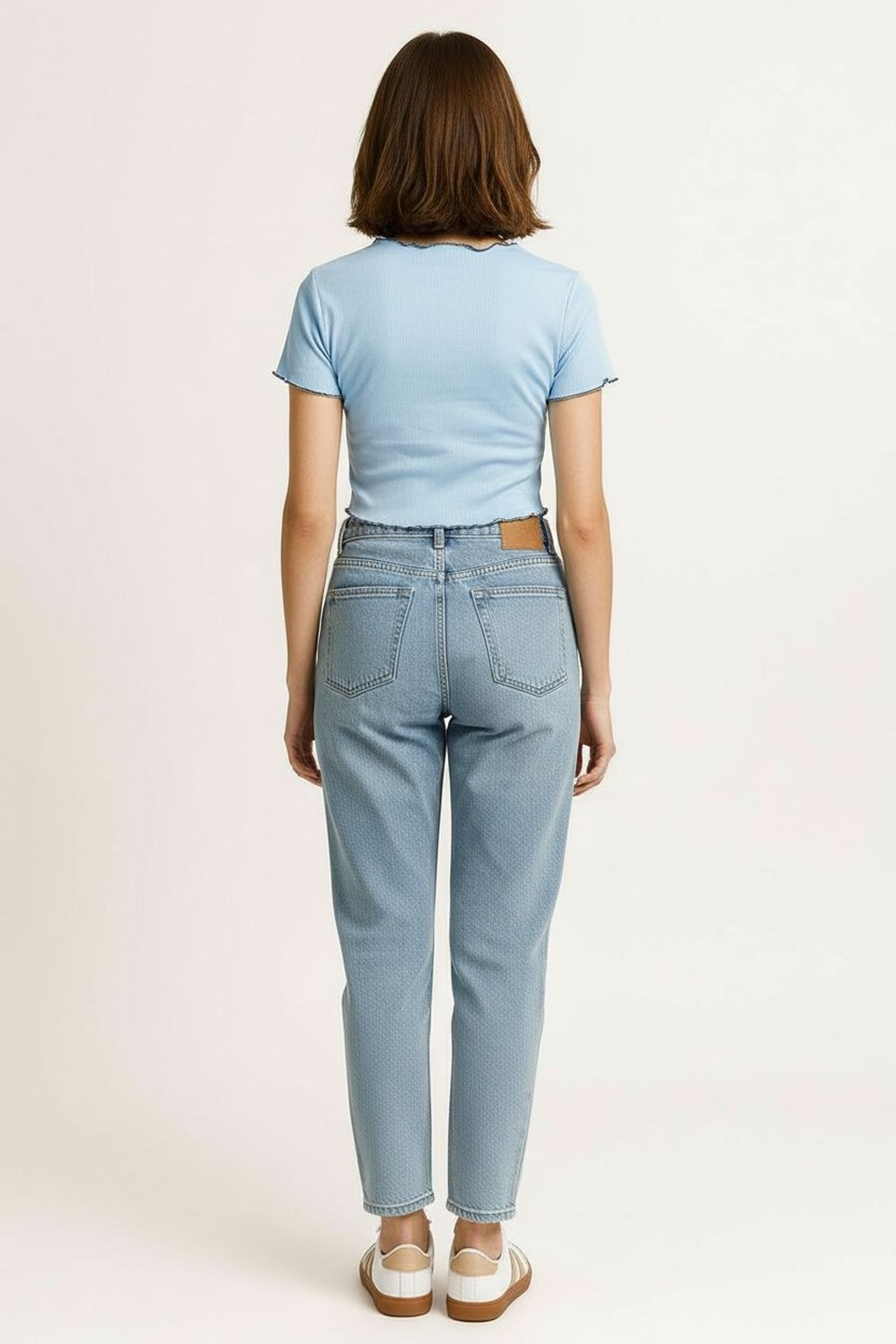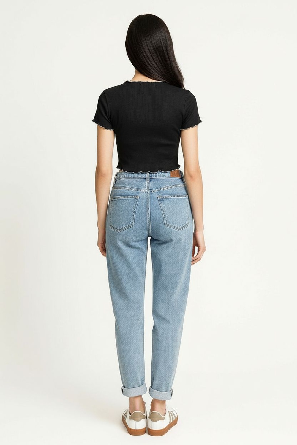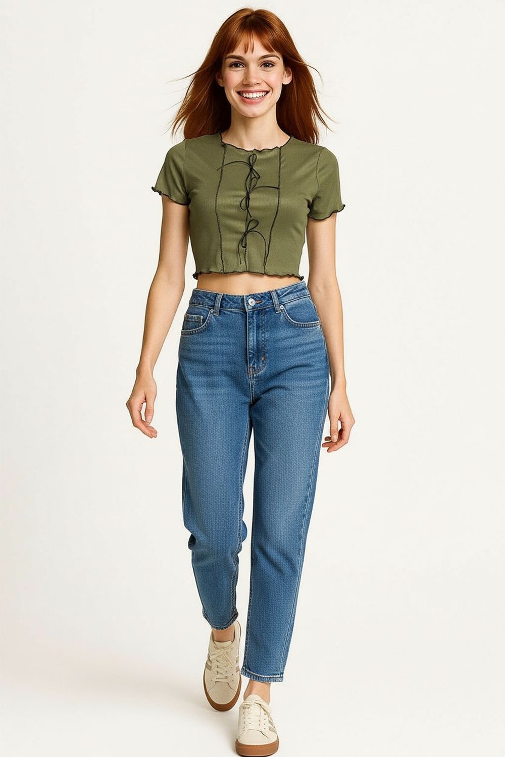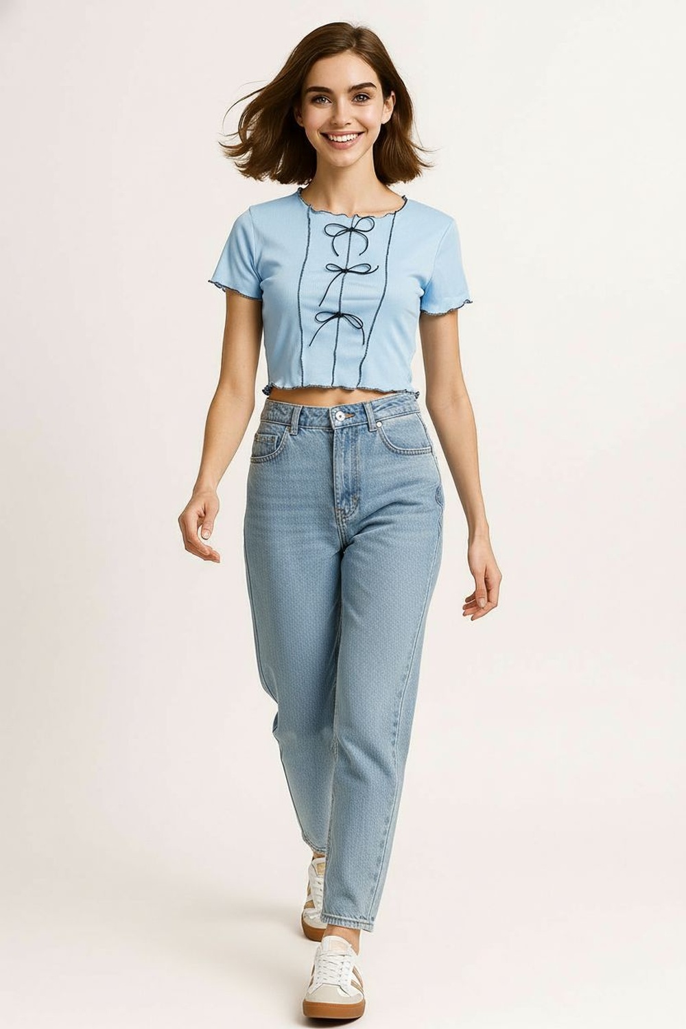 Playera corta con textura acanalada, detalle de moños en contraste que aportan un toque delicado, escote redondo con terminación en bies, silueta ajustada que realza la figura con comodidad, orilla ondulada que añade un acabado distintivo