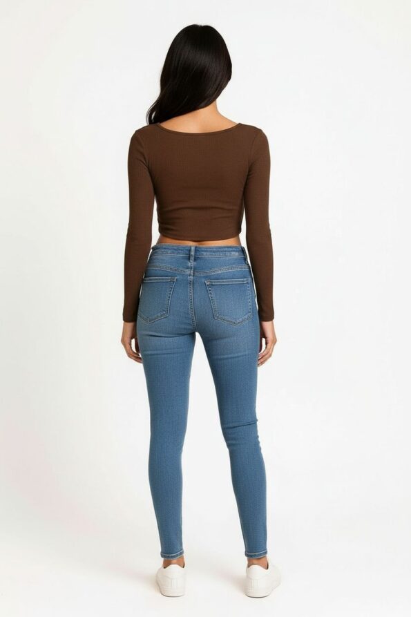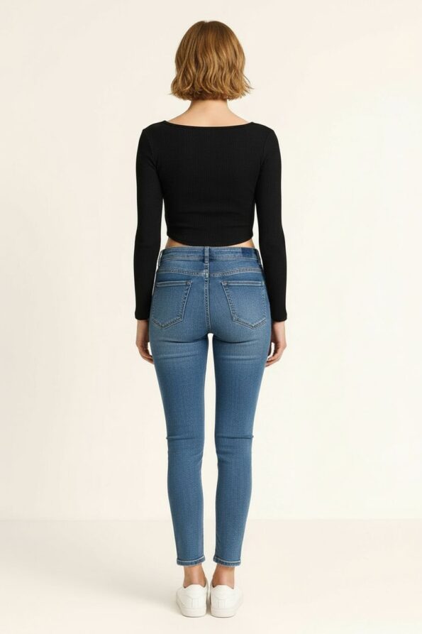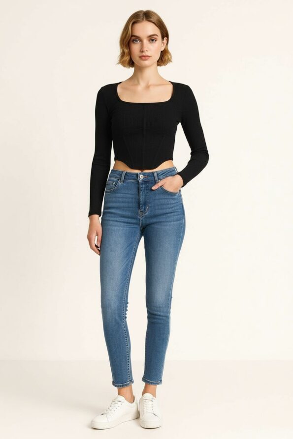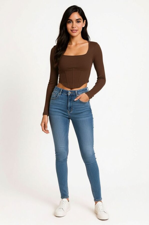 Playera de manga larga con escote cuadrado que realza la silueta, confección en tela rib elástica que aporta comodidad y mejor ajuste, cortes en la cintura que estilizan y definen la figura, diseño juvenil y moderno ideal para outfits casuales o combinaciones de temporada