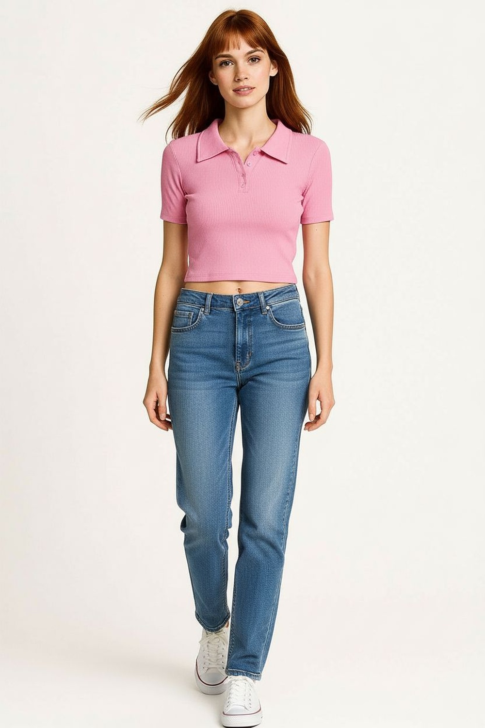Playera corta con cuello tipo polo y tapeta frontal con botones, manga corta que brinda libertad de movimiento, ajuste ceñido al torso que mantiene estructura definida, confección en tejido rib elástico que se adapta al cuerpo, acabado suave que proporciona comodidad durante el uso diario