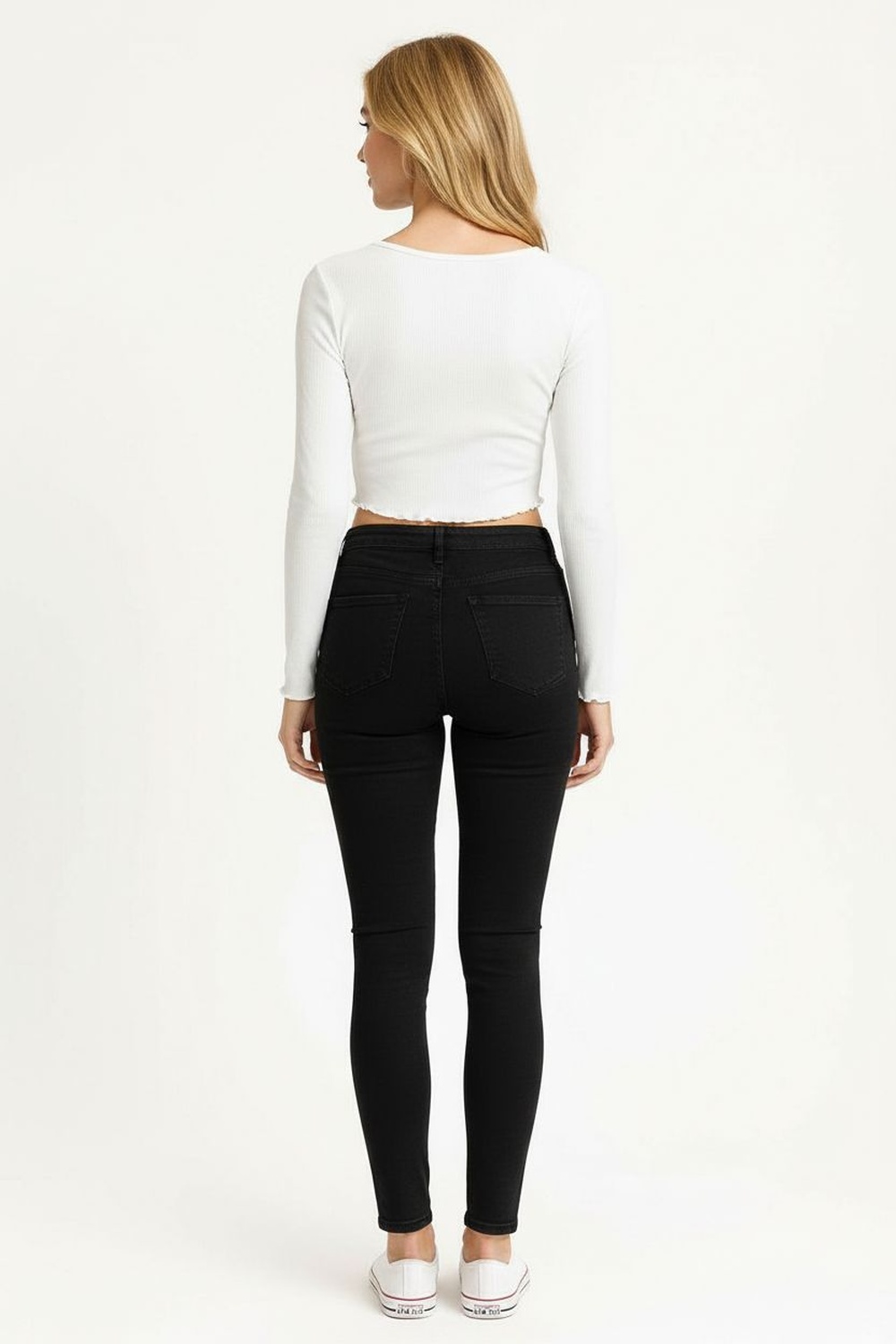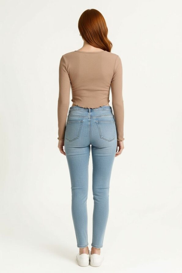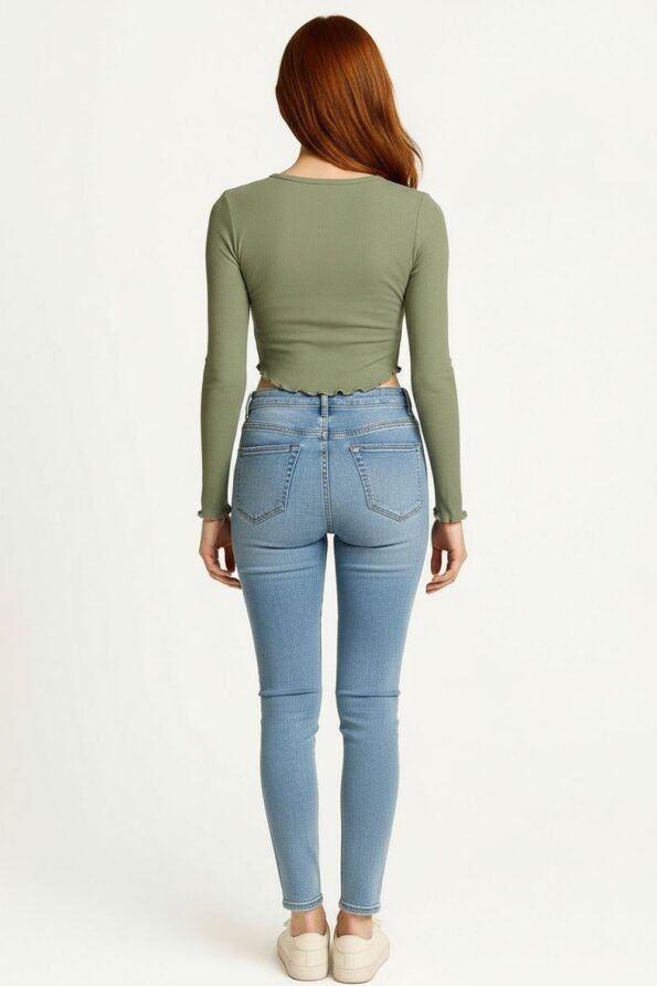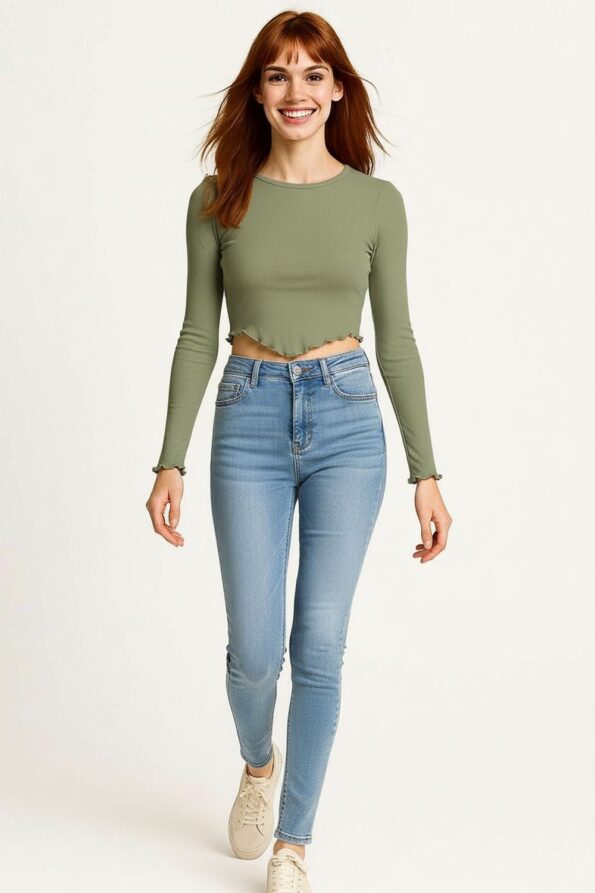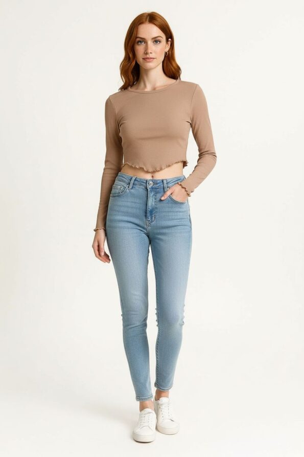 Playera de manga larga confeccionada en tejido acanalado que se ajusta al cuerpo resaltando la figura, cuello redondo con acabado fino que aporta un toque clásico, terminación ondulada en puños y basta que añade un detalle distintivo, textura suave y elástica que brinda comodidad y estilo en cada uso