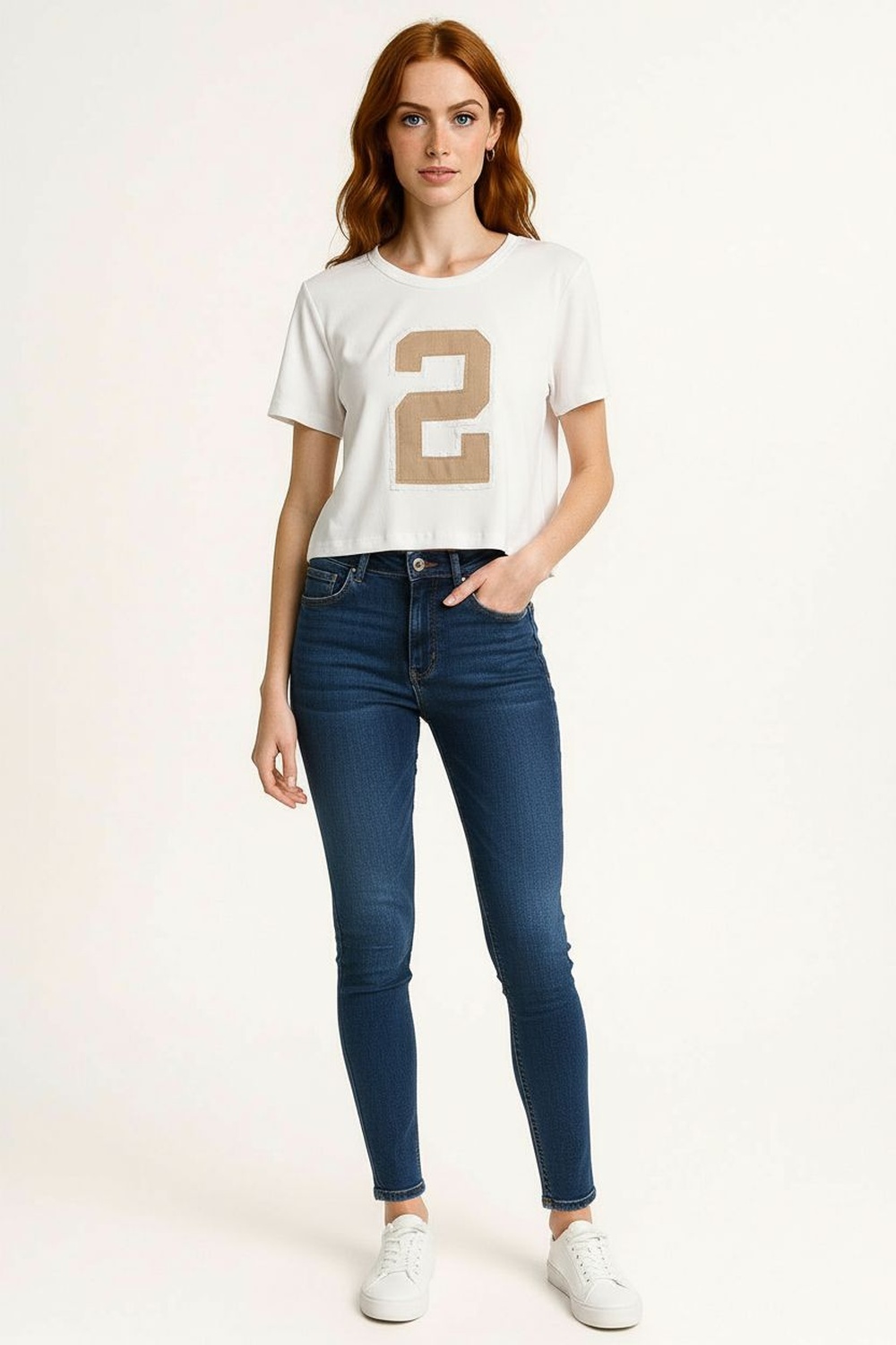 Playera rib con corte crop que estiliza la figura, cuello redondo que aporta comodidad, mangas cortas que permiten frescura, detalle frontal con número aplicado en textura contrastante que brinda un toque moderno y juvenil, confección en tejido acanalado que se ajusta al cuerpo con suavidad, prenda ligera y versátil que combina con atuendos casuales y urbanos