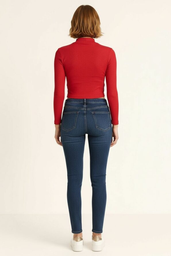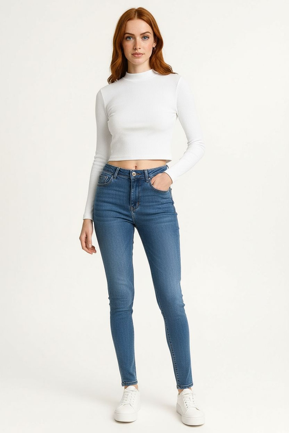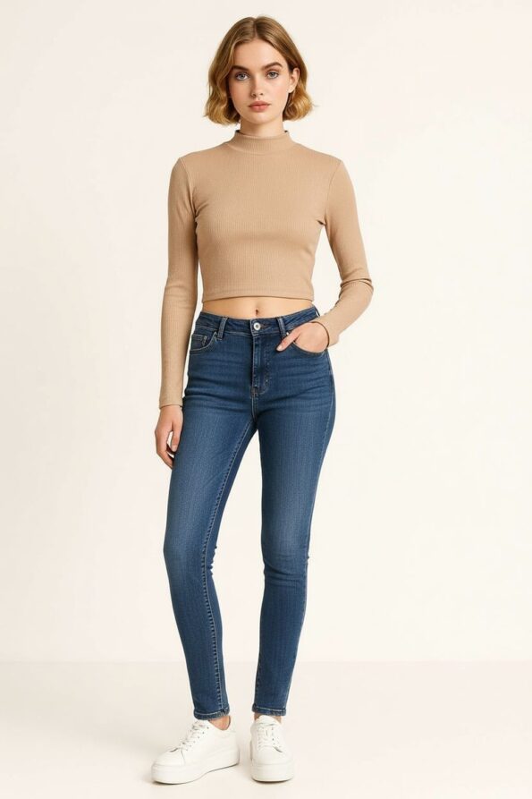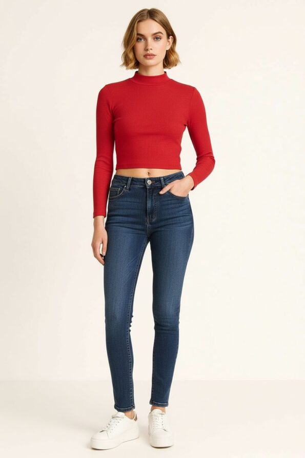 Playera de manga larga con cuello alto que estiliza la silueta y aporta un toque moderno, confeccionada en tejido rib que se ajusta suavemente al cuerpo, diseño corto que realza la figura y permite un look juvenil y versátil, corte recto que favorece distintos tipos de cuerpo, material elástico y ligero que asegura comodidad y libertad de movimiento en cada uso