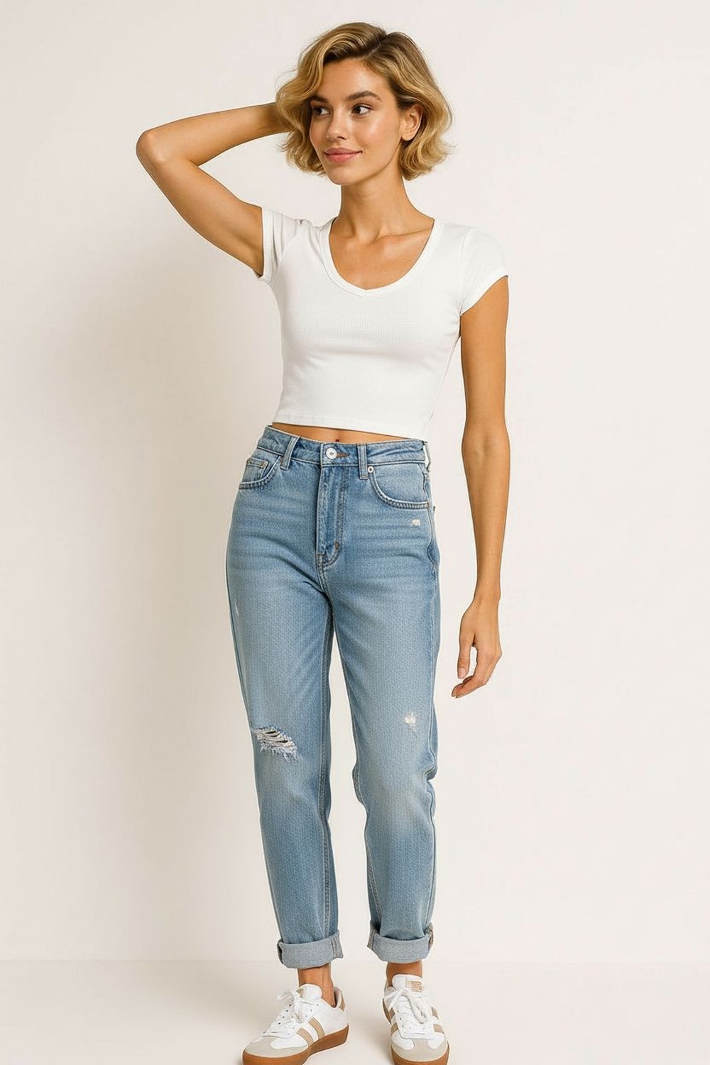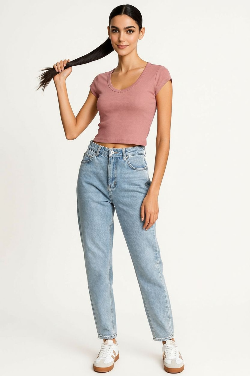 Playera de manga corta con escote en V que aporta amplitud visual, corte ajustado que se adapta al cuerpo, confección en tejido rib con elasticidad ligera, largo corto que brinda frescura al diseño, terminaciones suaves que mejoran la sensación al uso